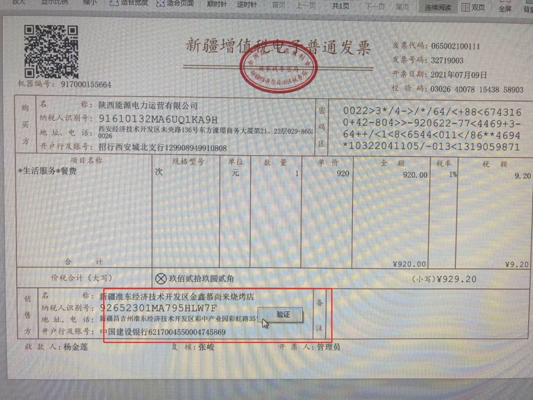 第四步,驗(yàn)證發(fā)票監(jiān)制章有效后,鼠標(biāo)移動(dòng)到左下角銷方信息處,點(diǎn)擊右鍵,彈出提示框,如下圖所示,點(diǎn)擊“驗(yàn)證”,彈出驗(yàn)證結(jié)果。