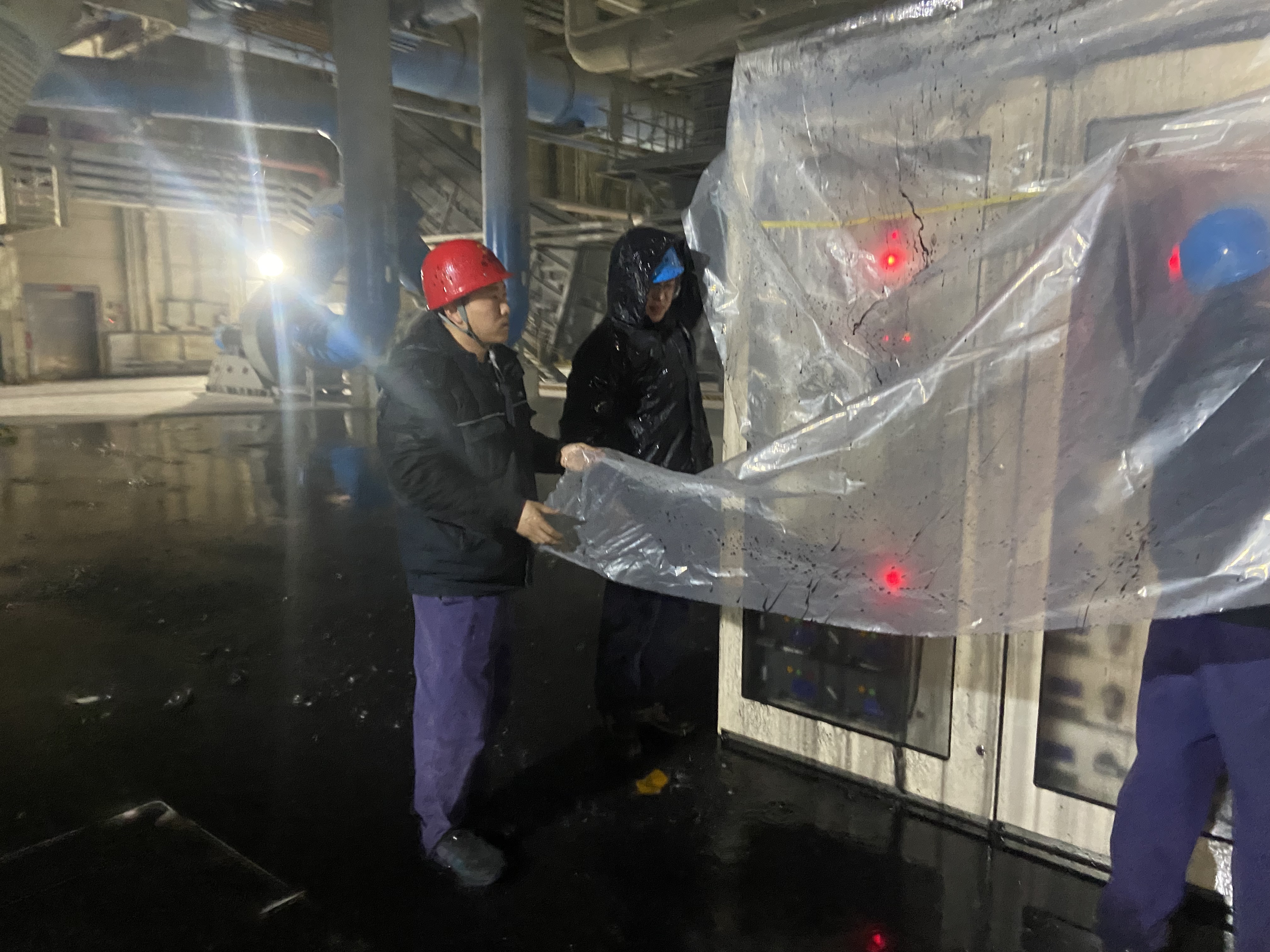 12月5日下午6:50,#3爐主電動給水門泄漏,專業(yè)主管立刻組織大家?guī)е芰喜肌⒛z帶趕往現(xiàn)場,大到盤柜、磨煤機(jī)接線盒,小至磨煤機(jī)加熱器接線盒、檢修箱都覆蓋起來細(xì)心呵護(hù),防止設(shè)備被淋濕造成故障。