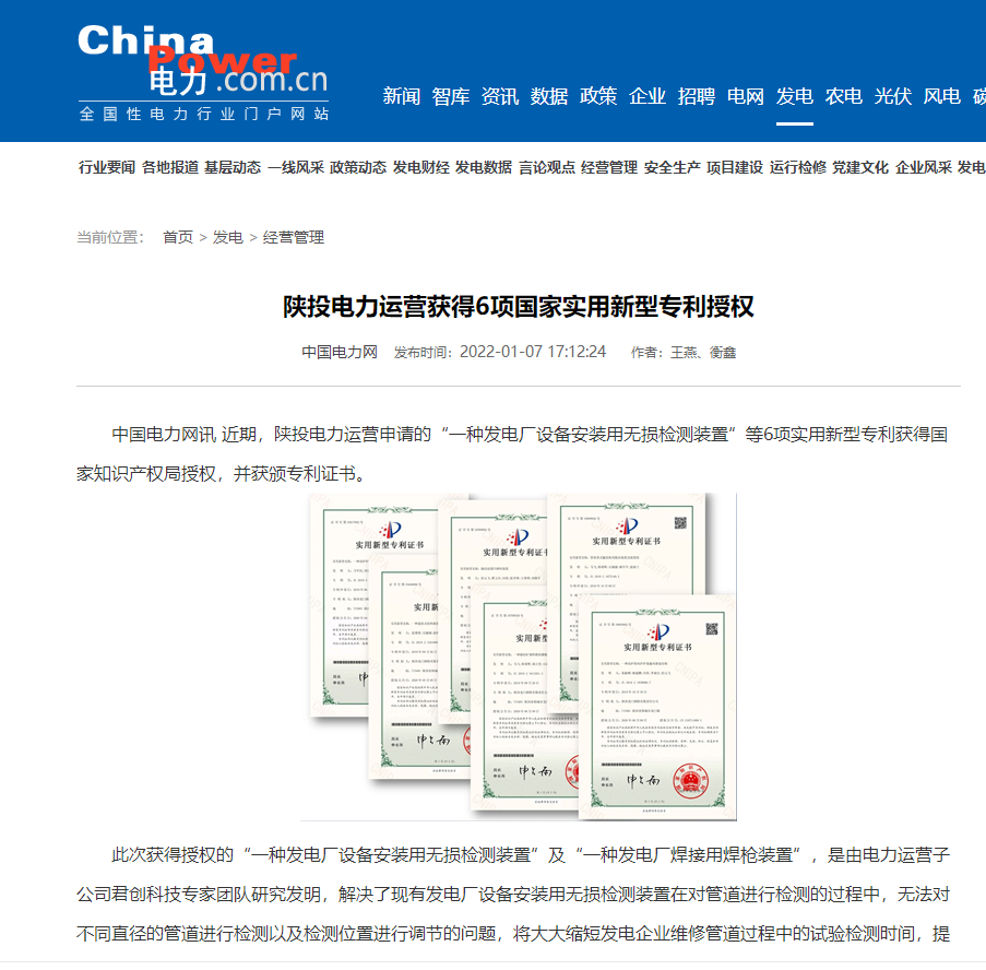 近期,陜投電力運營申請的“一種發(fā)電廠設備安裝用無損檢測裝置”等6項實用新型專利獲得國家知識產(chǎn)權局授權,并獲頒專利證書。