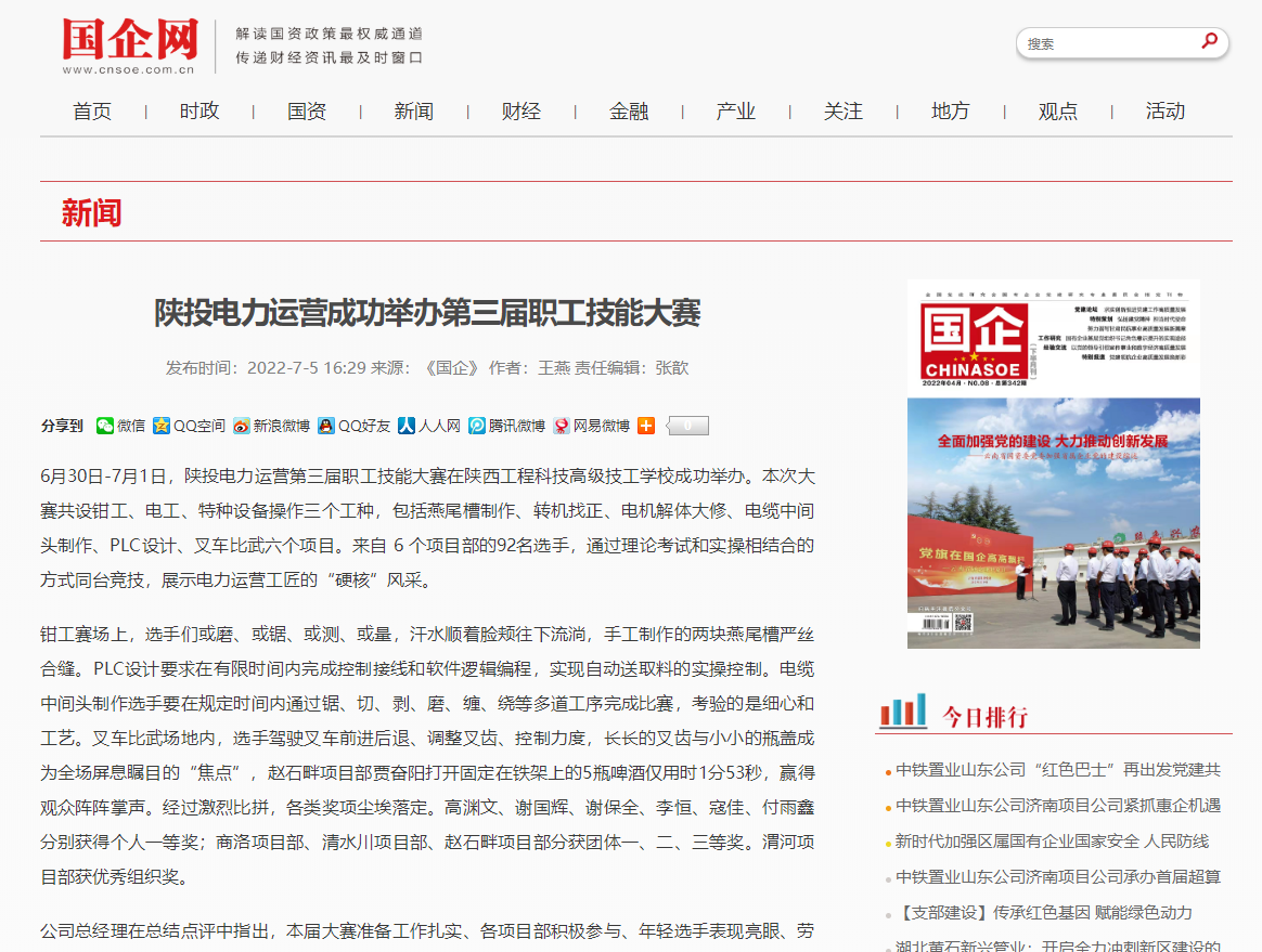 6月30日——7月1日,公司第三屆職工技能大賽在陜西工程科技高級(jí)技工學(xué)校成功舉辦。集團(tuán)經(jīng)營(yíng)管理部主任梁軍軍參加閉幕式并為獲獎(jiǎng)選手頒獎(jiǎng)。陜能股份總經(jīng)濟(jì)師楊玉林、生產(chǎn)技術(shù)部主任王軍泓出席開(kāi)幕式。