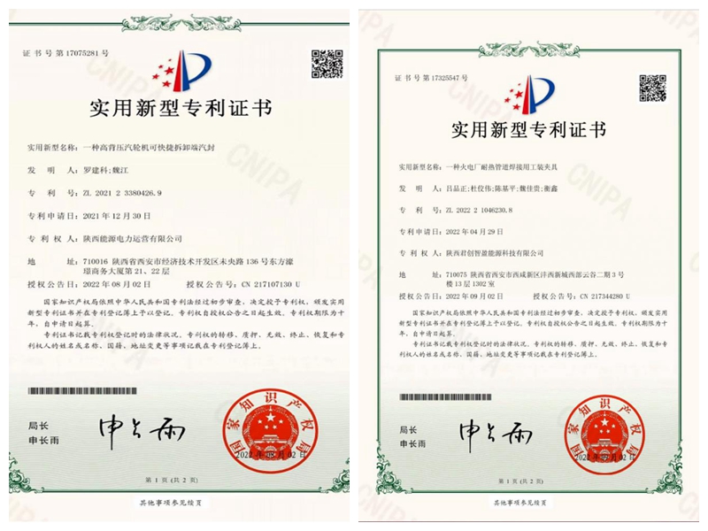 日前,公司“一種火電廠耐熱管道焊接用工裝夾具”、君創(chuàng)科技“一種高背壓汽輪機(jī)可快捷拆卸端汽封”獲得國(guó)家實(shí)用新型專利授權(quán)。截止目前,公司共獲取22項(xiàng)國(guó)家實(shí)用新型專利授權(quán),并在實(shí)際工作中陸續(xù)推廣。