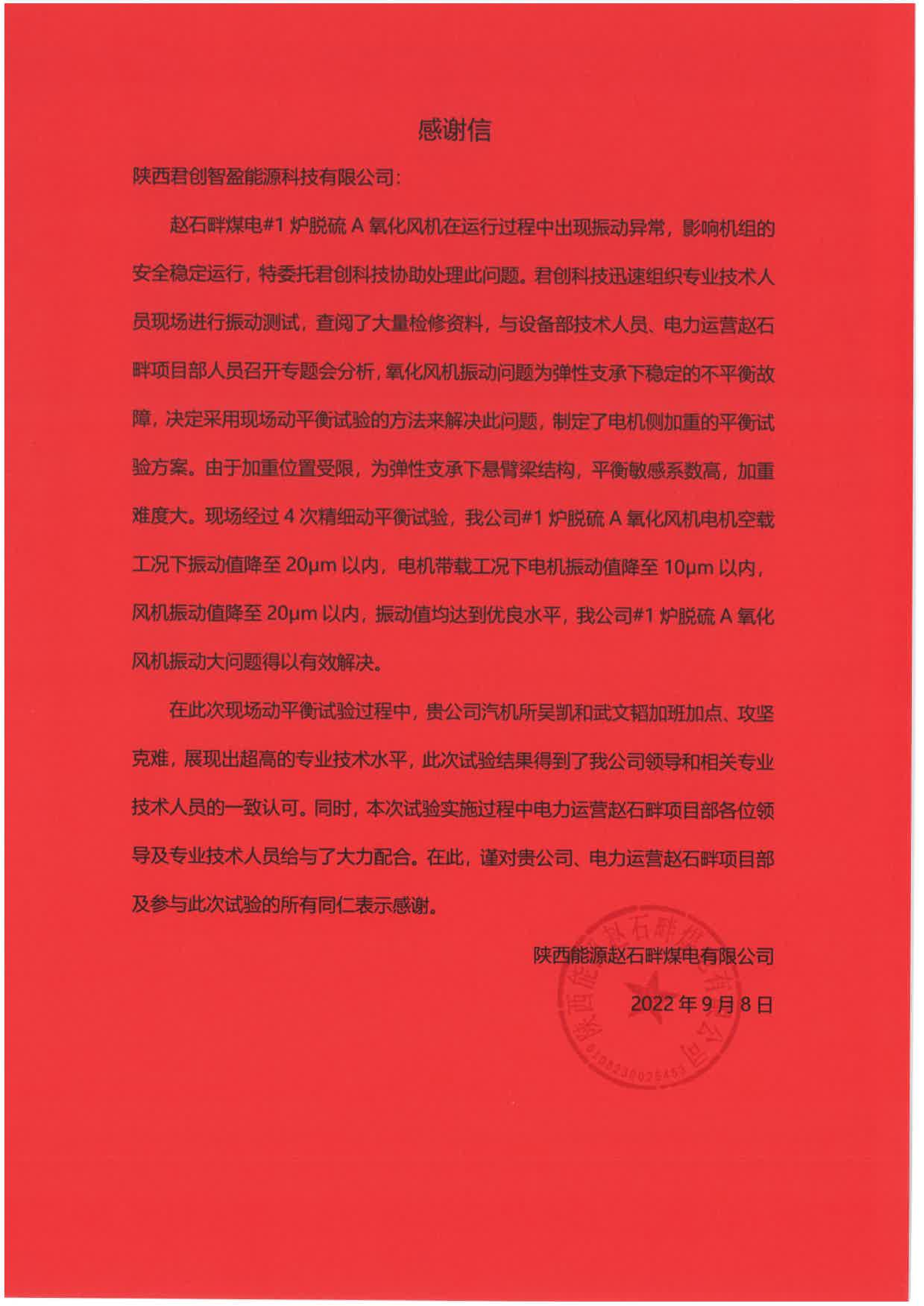 9月9日,趙石畔煤電發(fā)來感謝信,對君創(chuàng)科技高質(zhì)量完成#1爐脫硫A氧化風機動平衡試驗表示感謝。