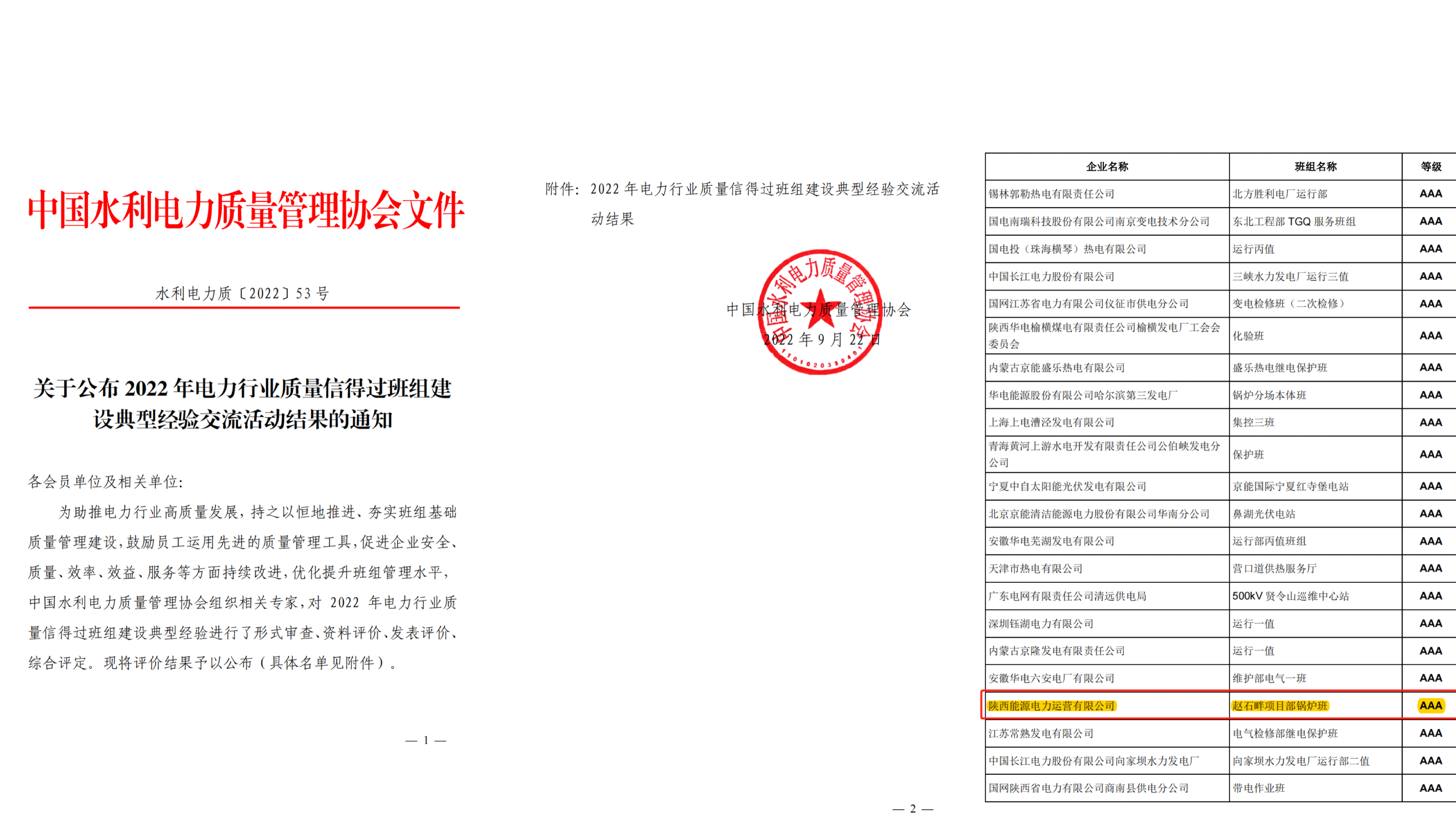 日前,由中國水利電力質量管理協(xié)會舉辦的2022年全國電力行業(yè)質量信得過班組建設典型經驗交流活動結果出爐,趙石畔項目部鍋爐班被評為AAA班組,成為集團公司唯一在本次活動中獲此殊榮的電力班組。