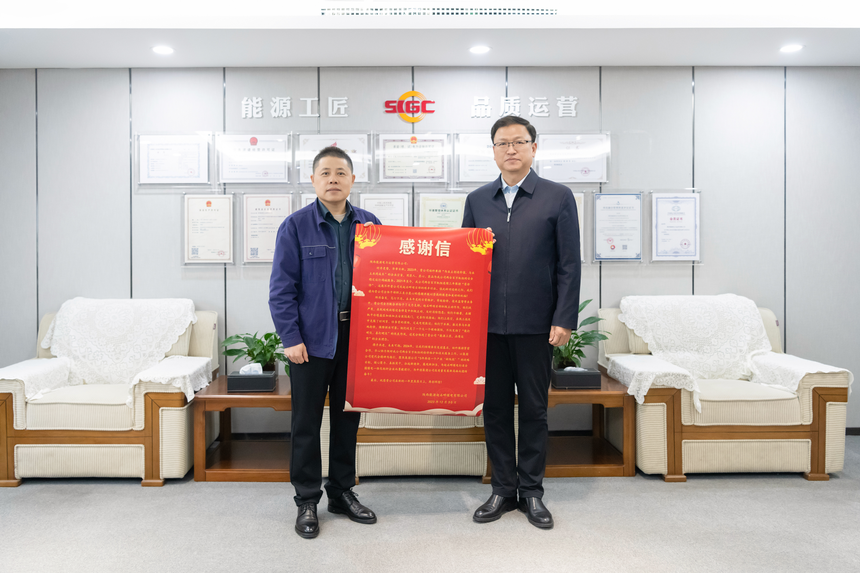 1月18日上午,趙石畔煤電黨委副書記、法定代表人王學(xué)民為公司送來(lái)感謝牌匾及感謝信,對(duì)趙石畔項(xiàng)目部一直以來(lái)的實(shí)干與付出表示感謝。