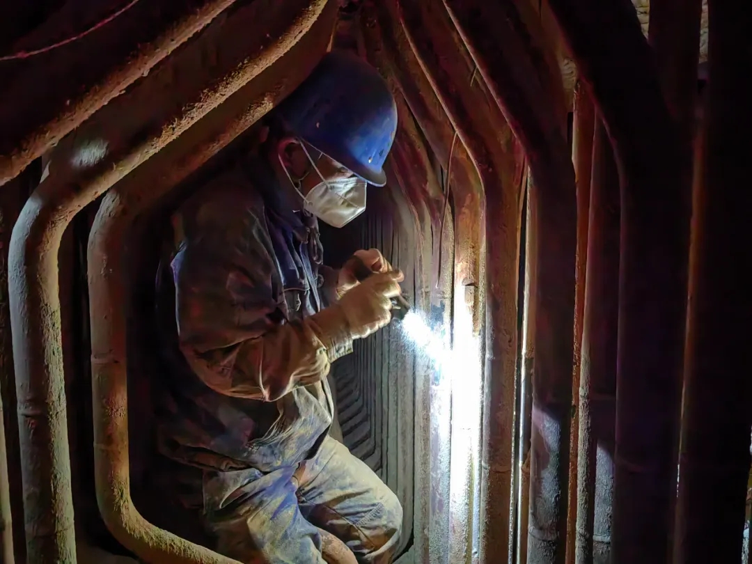 汽包壁溫和鍋爐大罩殼溫度元件是監(jiān)視超溫、泄漏的重要設(shè)備,關(guān)乎機(jī)組安全穩(wěn)定運(yùn)行。由于溫度元件處在鍋爐大罩殼與機(jī)箱管排之間,周邊管排布置復(fù)雜、保溫材料多,武朝輝只能帶著同事鉆進(jìn)狹小的空間內(nèi)進(jìn)行操作。“這地方又悶又熱,空間又小,一下子要更換106個(gè)‘鍋爐體溫計(jì)’,黨員不上誰(shuí)上!”武朝輝擦著汗,樂(lè)呵呵地說(shuō)道。
