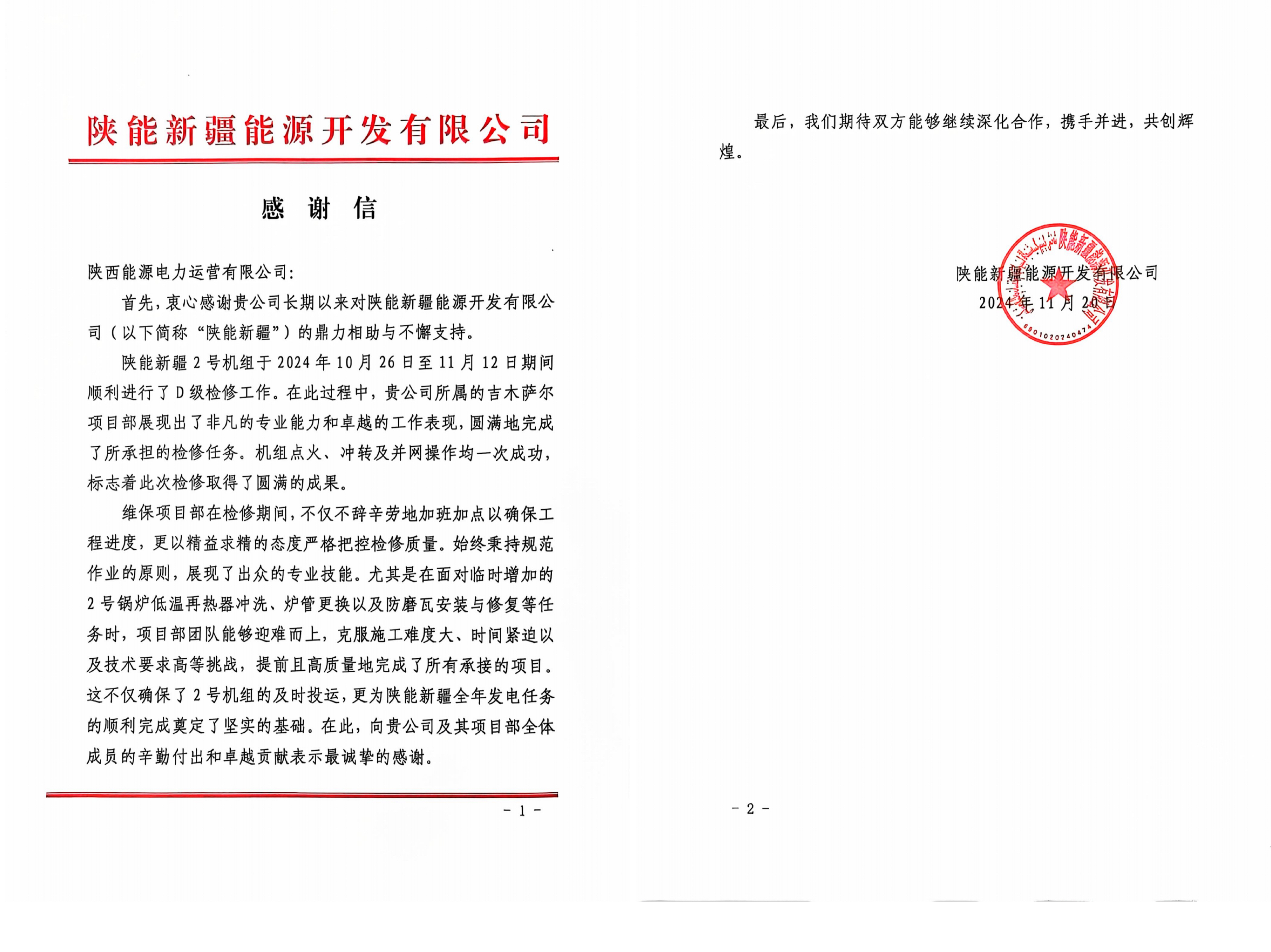 日前,陜能新疆發(fā)來感謝信,對吉木薩爾項(xiàng)目部高效優(yōu)質(zhì)完成#2機(jī)D修項(xiàng)目表示感謝。