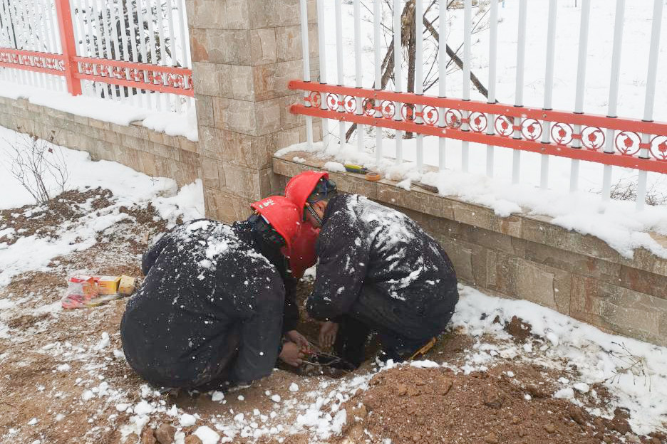 1月9日,趙石畔項目部電氣班工作人員,迎著飄飛的雪花,冒著室外零下十幾度的嚴寒,輪流用鐵鍬小心挖開凍土,抽絲剝繭,查找電纜故障。最終,經(jīng)過4個多小時的不懈努力,順利恢復(fù)了34盞路燈的照明。