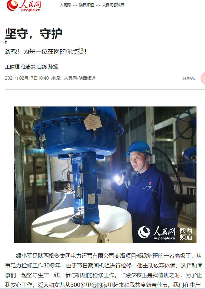 李海峰是陜西投資集團(tuán)電力運營有限公司清水川項目部員工。從2月6日以來,項目部全體人員一直奮戰(zhàn)在生產(chǎn)一線,24小時兩班倒全程參與業(yè)主方機(jī)組的消缺工作?!俺χ梗跈z修現(xiàn)場吃完一頓簡單而特殊的年夜飯后,我和我的同事們又馬不停蹄,全力投入搶修工作,為確保除夕夜萬家燈火的溫馨,默默奉獻(xiàn)著自已的力量?!?李海峰說。