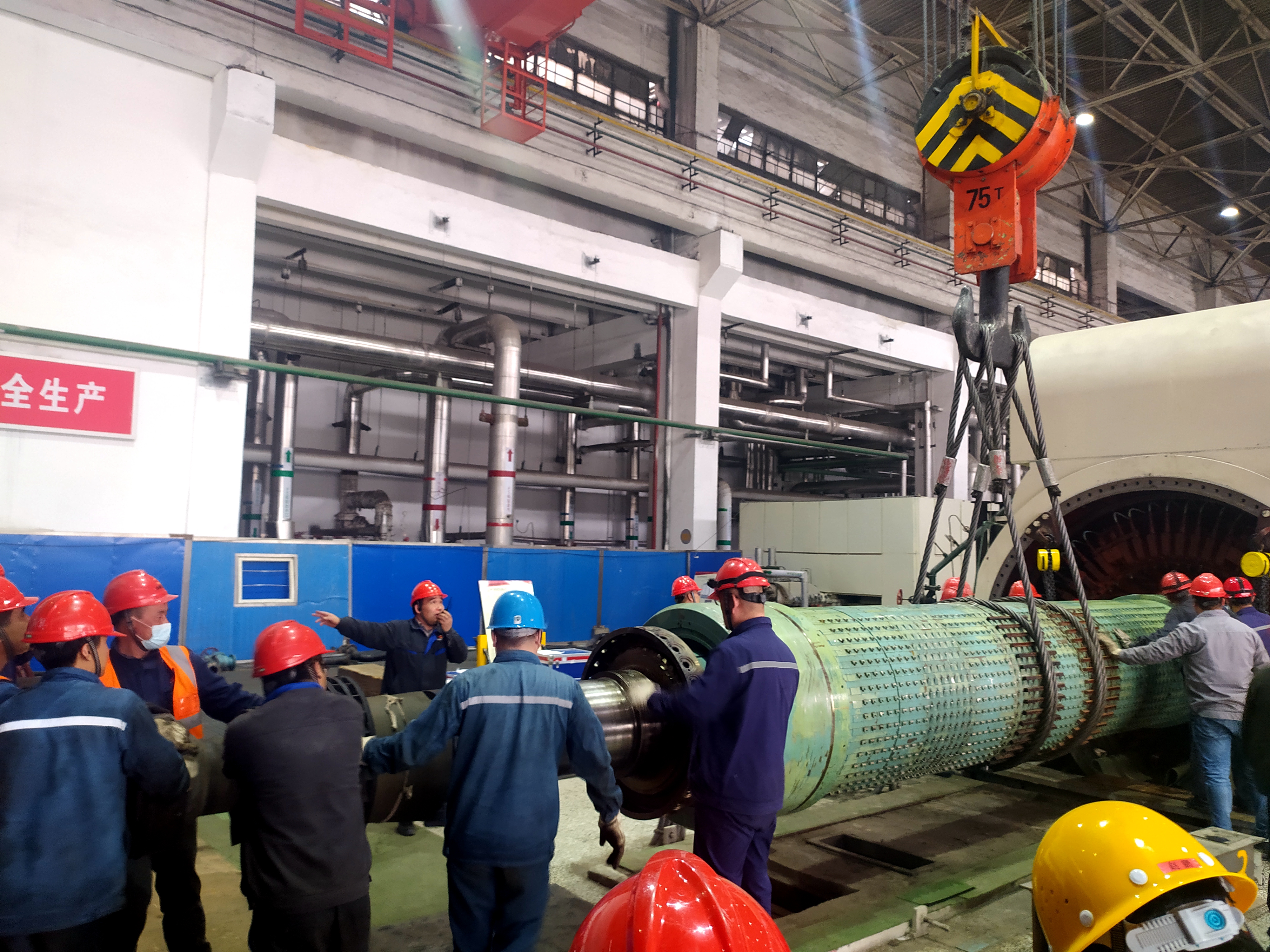 3月30日,在起重人員的指揮下,行車和拉倒鏈人員密切配合,笨重的轉(zhuǎn)子緩緩向外移動。全場工作人員緊張地圍在機頭前,目不轉(zhuǎn)睛地關(guān)注著轉(zhuǎn)子與發(fā)電機“膛內(nèi)”的間隙變化,不時沖起吊人員緊急揮手示意,以免對轉(zhuǎn)子造成一絲一毫的傷害。現(xiàn)場所有人員屏息靜氣,在指揮人員有節(jié)奏的哨聲中盯著轉(zhuǎn)子的“一舉一動”。17:00,發(fā)電機轉(zhuǎn)子這條蟄伏多日的“長龍”終于被“五花大綁”從定子膛內(nèi)乖乖抽出。