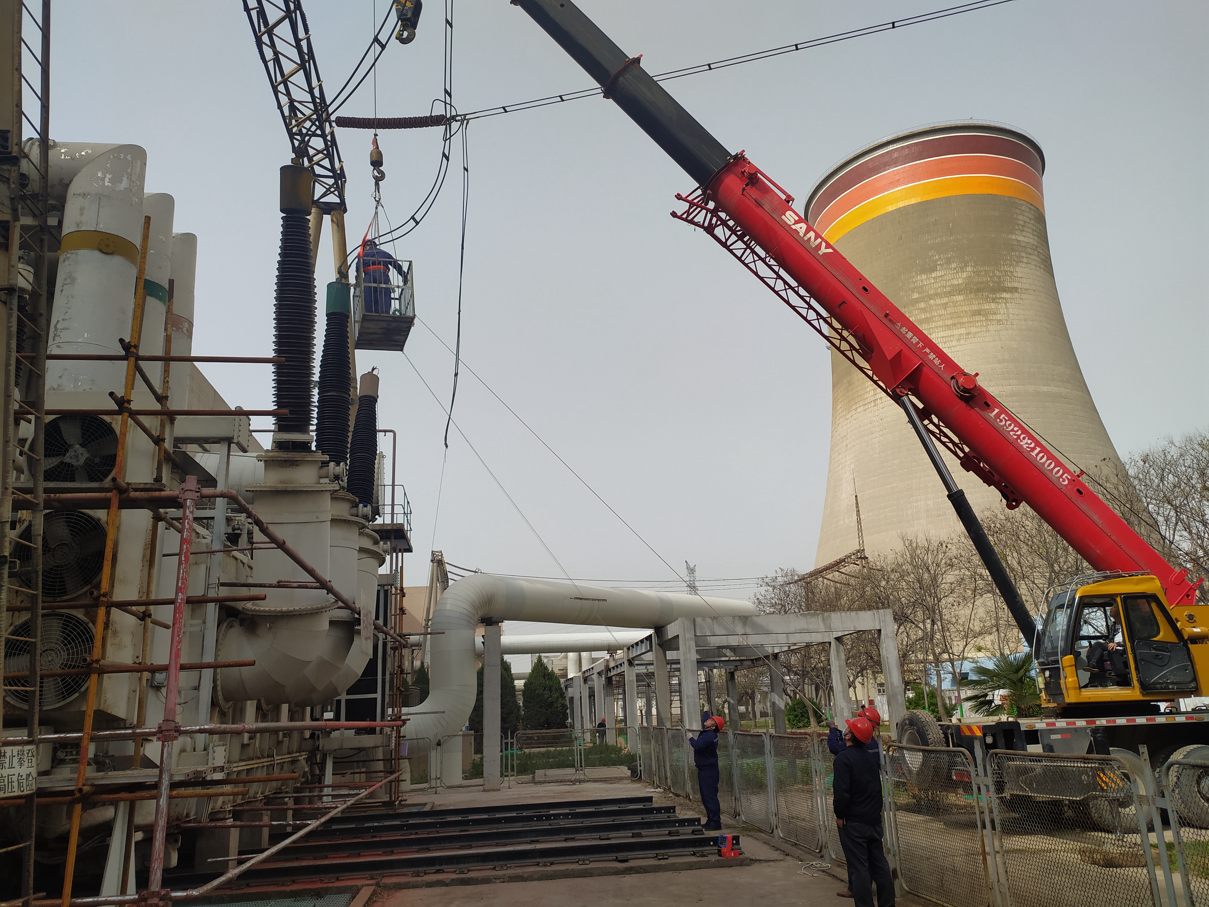 10:00,承擔此項任務(wù)的儀電隊變電班對照檢修方案,一一落實人員分配、工器具檢查、作業(yè)流程等,現(xiàn)場進行“安全技術(shù)兩交底”。10:30,兩名檢修人員被吊車緩緩送至距地面6米處的高空,連接引線拆除正式開始。由于沒有固定的操作平臺,且引線拆除需要兩人密切協(xié)作,要求上下反復溝通,及時調(diào)整作業(yè)位置。一處接線拆除下來,時間已到了12:00,可工作人員一刻也沒停息,立即投入下一處拆除工作?!皼]辦法,中午只能加班了,今天的拆線是給后面進行的試驗開道,我們不完工,他們的工作就沒法開展!”現(xiàn)場協(xié)調(diào)工作的變電班班長柯輝抹著臉上的汗水憨笑著說。