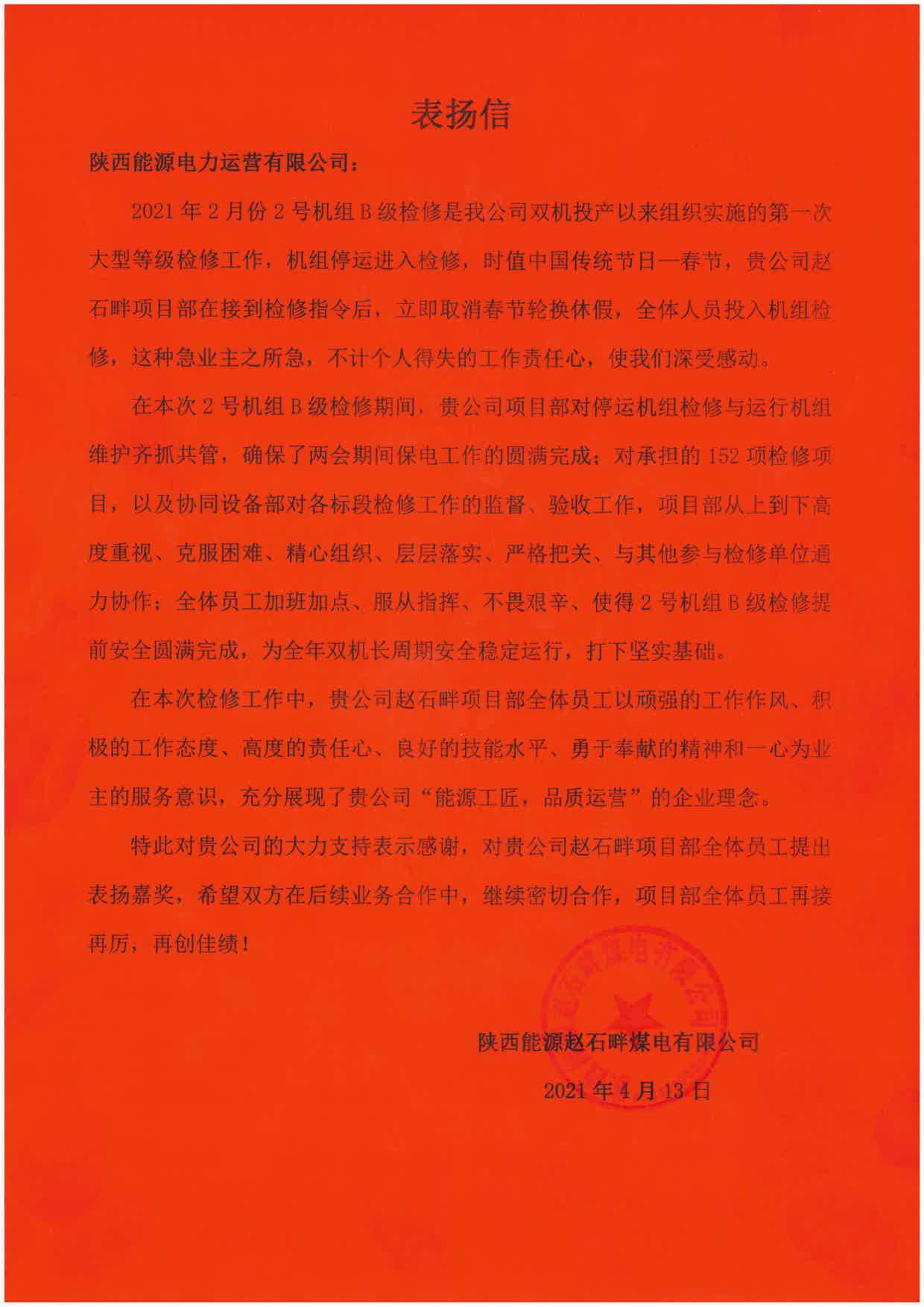 4月14日,公司收到陜西能源趙石畔煤電有限公司的表揚信,對趙石畔項目部在2月份雙機投產(chǎn)后的第一次大型等級檢修和“兩會”保電工作中的付出表示高度贊揚。