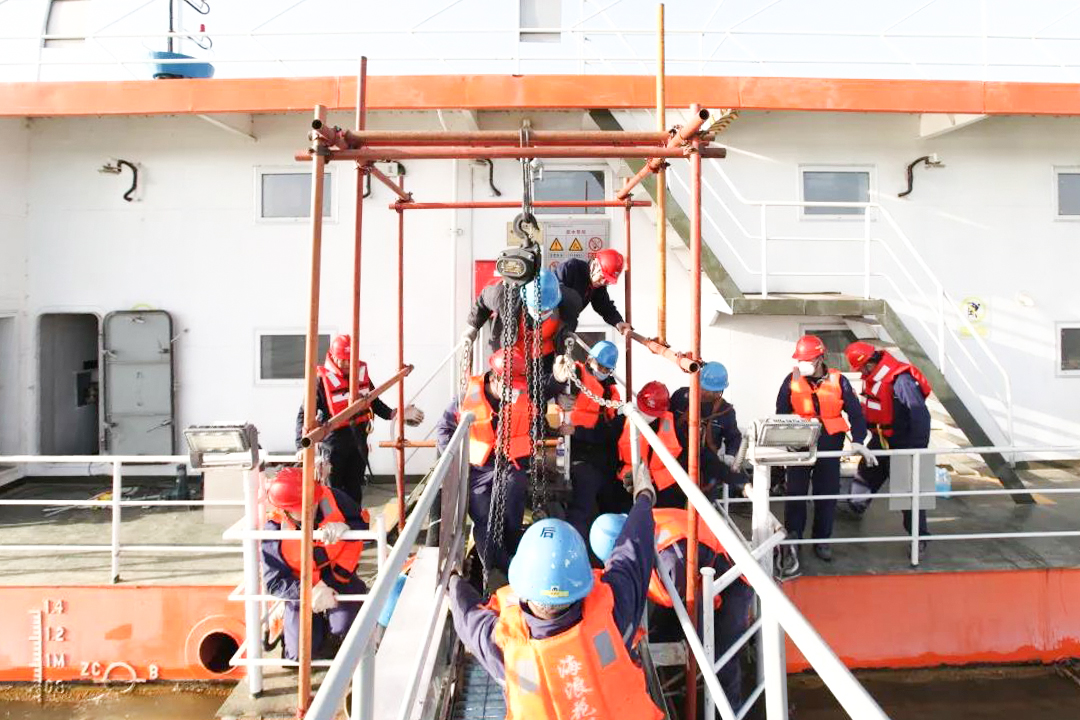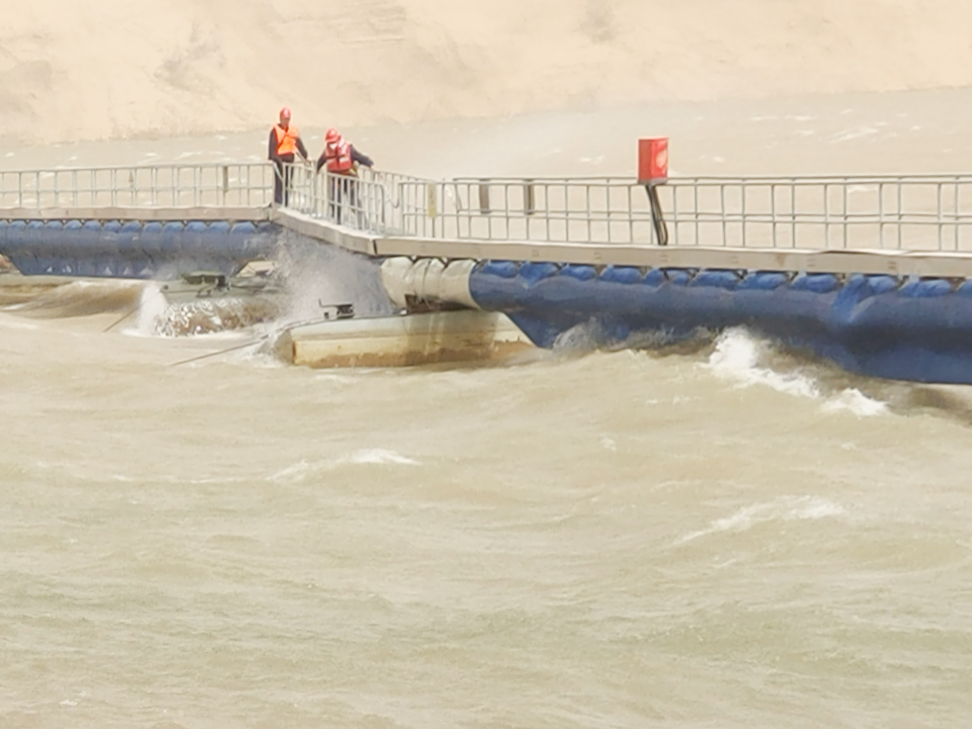 搶修再忙,安全不忘。各級管理人員和工作負責人嚴格履行安全和技術(shù)兩交底,認真履行安全監(jiān)督責任。大家穿好救生衣、系好安全帶,肩扛手拉、牽引起吊,一點點恢復移位的取水管線。面對極端大風天氣造成的突發(fā)事件,趙石畔項目部沉著應(yīng)戰(zhàn),與業(yè)主方積極溝通配合,從方案制定到協(xié)調(diào)管理再到后勤保障,各項工作有條不紊,僅用4天時間就完成了搶通工作,調(diào)整了取水泵船、浮箱、庫底錨鏈,增加了2、3、4號浮箱錨鏈4個,新放固定鋼繩600米,有效避免斷水停機事故的發(fā)生,保障了機組安全穩(wěn)定運行,提高了項目部關(guān)鍵時刻“拉得出、打得響”的應(yīng)急處置能力。