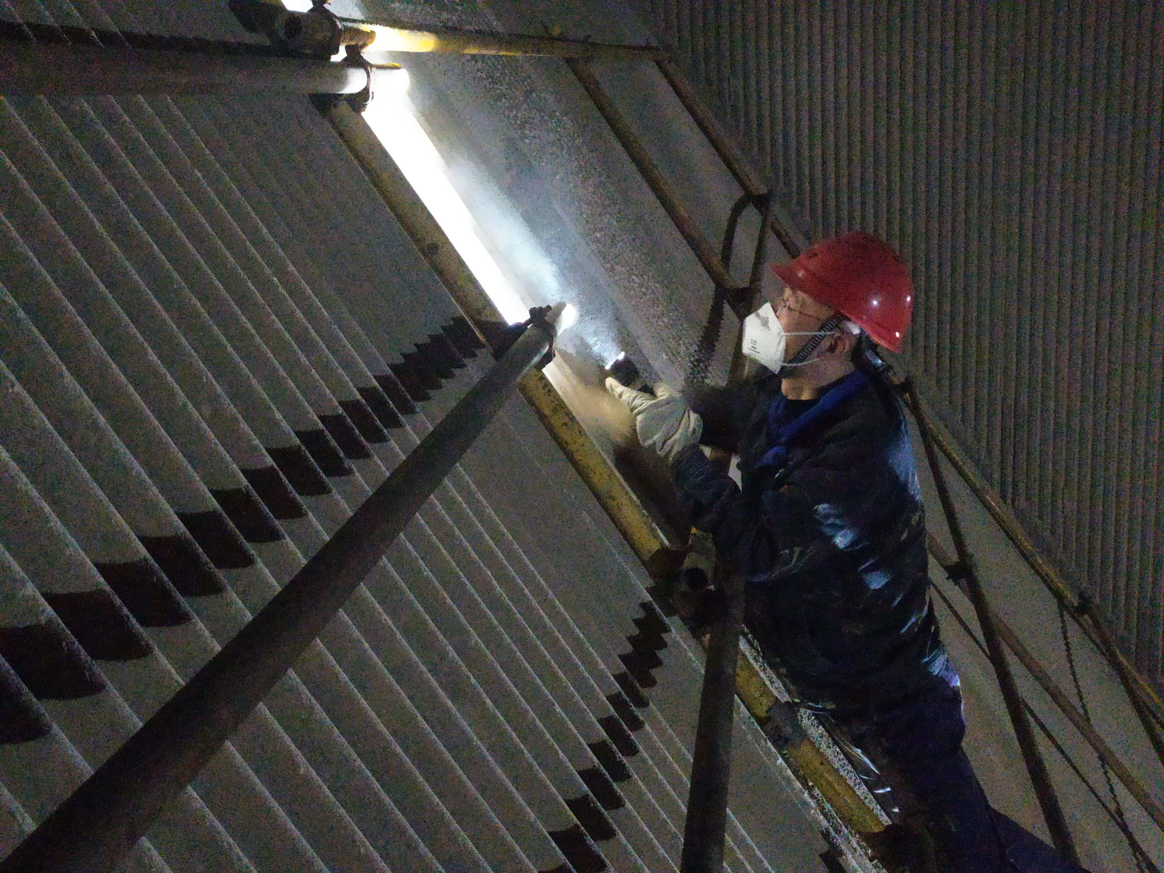 12米水冷壁渣斗內(nèi),工作人員正沿著密密麻麻的管排一根接著一根緊張地進行查漏工作。劉宏在外面系好安全帶后,“呲溜”一聲從40厘米見方的人孔進了爐膛。我看了看人孔大小,又瞅瞅自己的腰圍,只好作罷。進了渣斗,劉宏向工作人員詢問了兩句工作情況,就踩著梯子,拂去附著在管道上的煤粉,一段一段用手摸著,尋找“病灶”。一排管束摸完下來,劉宏又“呲溜”一聲鉆了出來。