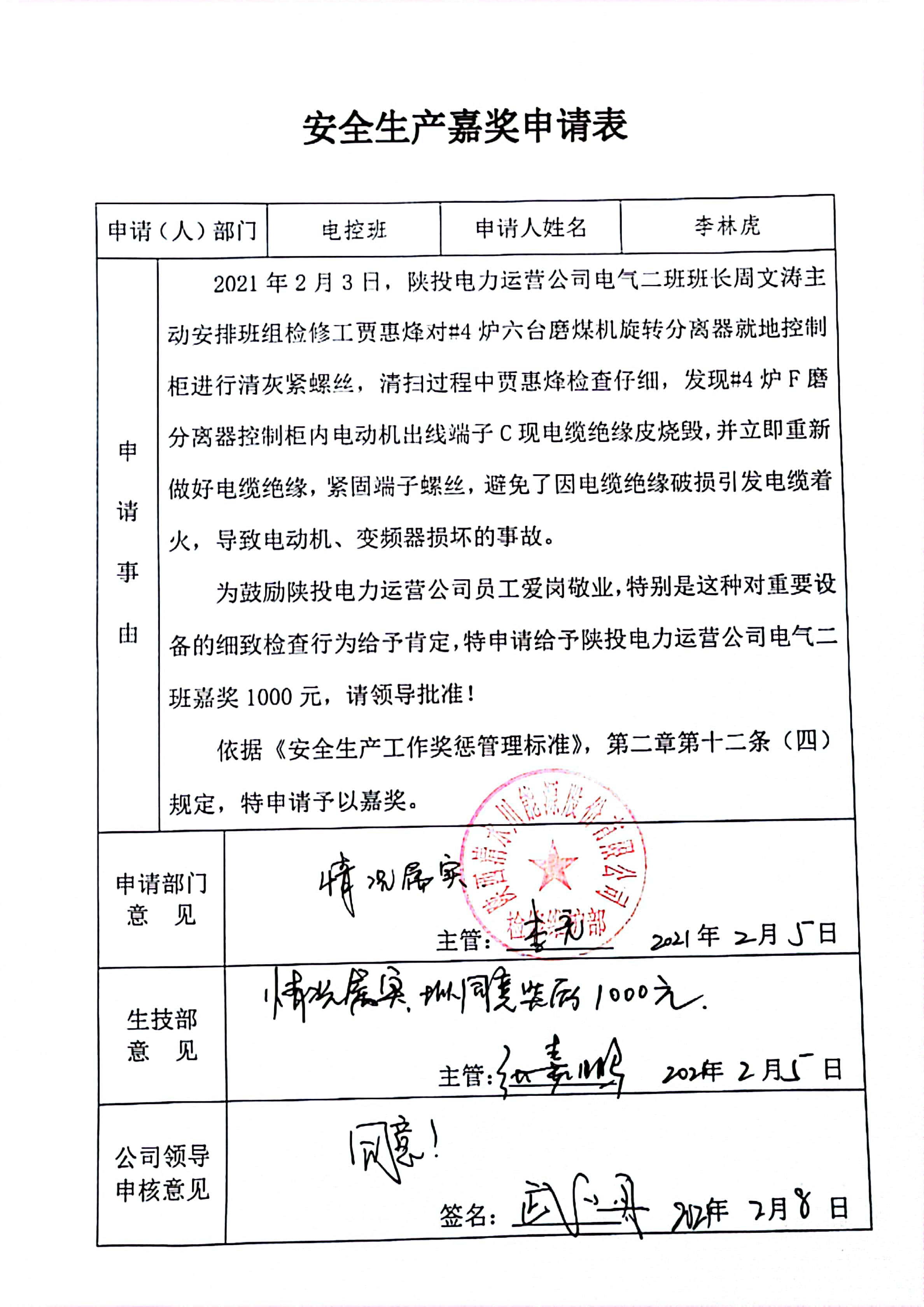 2021年2月1日,清水川#4機(jī)組臨停搶修,電氣二班在完成缺陷消除和點檢安排的工作外,主動出擊,對磨煤機(jī)分離器控制柜、空預(yù)器漏風(fēng)系統(tǒng)控制柜、除塵PC段開關(guān)柜等進(jìn)行清掃檢查,并發(fā)現(xiàn)#4爐F磨煤機(jī)分離器控制柜內(nèi)電動機(jī)出線端子C相電纜絕緣皮燒毀的缺陷。班組立即做出相應(yīng)措施,重新做好電纜絕緣,并緊固端子,避免了因電纜絕緣破損引發(fā)電纜著火,導(dǎo)致電動機(jī)、變頻器燒毀的危險,得到了業(yè)主方的認(rèn)可和贊揚(yáng)。