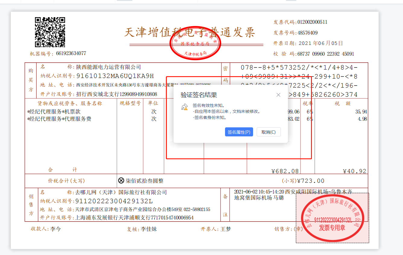如果銷方簽名有效,顯示驗(yàn)證結(jié)果為“該簽章有效!自應(yīng)用本簽章以來(lái),文檔內(nèi)容未被修改”。
