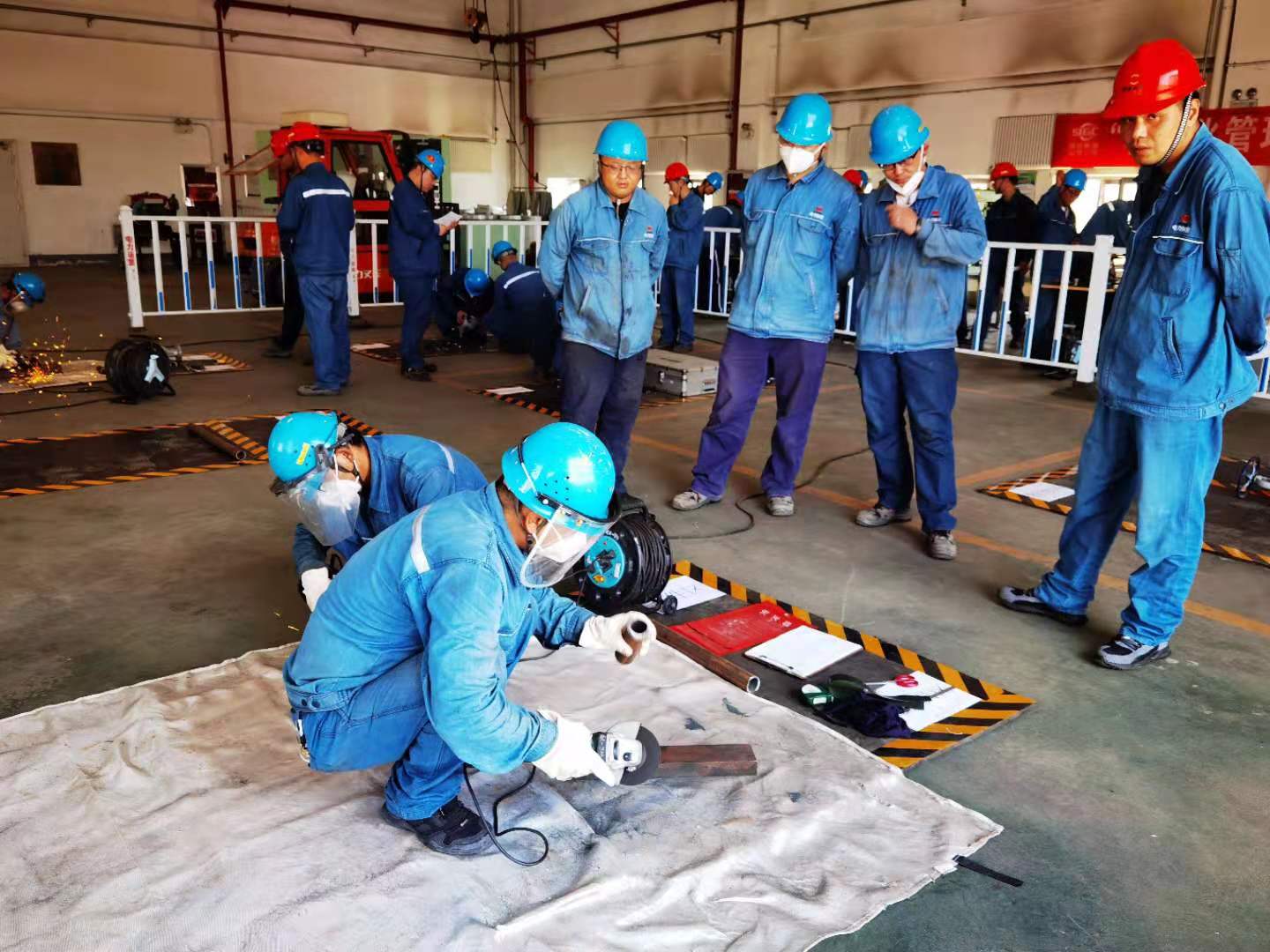 裁判員一聲“開始”,各小組迅速進(jìn)入預(yù)定的比賽區(qū)域,兩人一組,配合默契。機(jī)務(wù)組參賽選手爭分奪秒地采用角磨機(jī)按預(yù)給尺寸進(jìn)行坡口制作、管口打磨。轉(zhuǎn)子找中心過程中,隊員們沉穩(wěn)從容,熟練地架表、測量、記錄,無論是實驗操作還是綜合計算,每個人都精益求精,奮勇爭先。儀電組參賽選手也不甘示弱,有條不絮地進(jìn)行著電氣盤柜布線、電烙鐵焊接及電動機(jī)布線,每一步都態(tài)度認(rèn)真、操作規(guī)范。經(jīng)過激烈角逐,機(jī)務(wù)組氣化水班、儀電組電氣1班分別榮獲技能競賽第一名。
