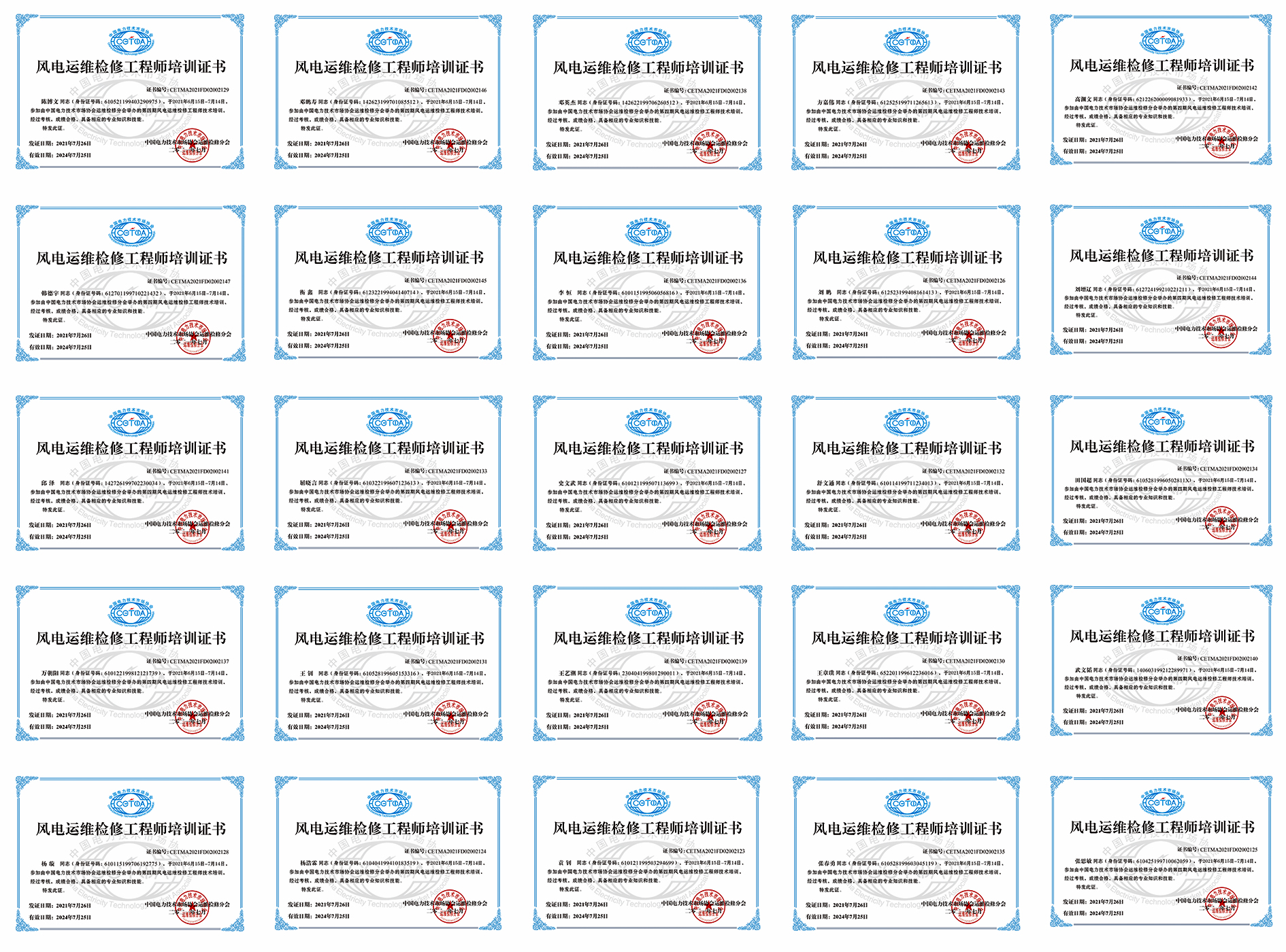 近日,公司參加了中國電力技術(shù)市場協(xié)會運維檢修分會舉辦的第四期風(fēng)電運維檢修工程師技術(shù)培訓(xùn)班,25名學(xué)員順利通過考試并全部取得《風(fēng)電運維檢修工程師培訓(xùn)證書》。