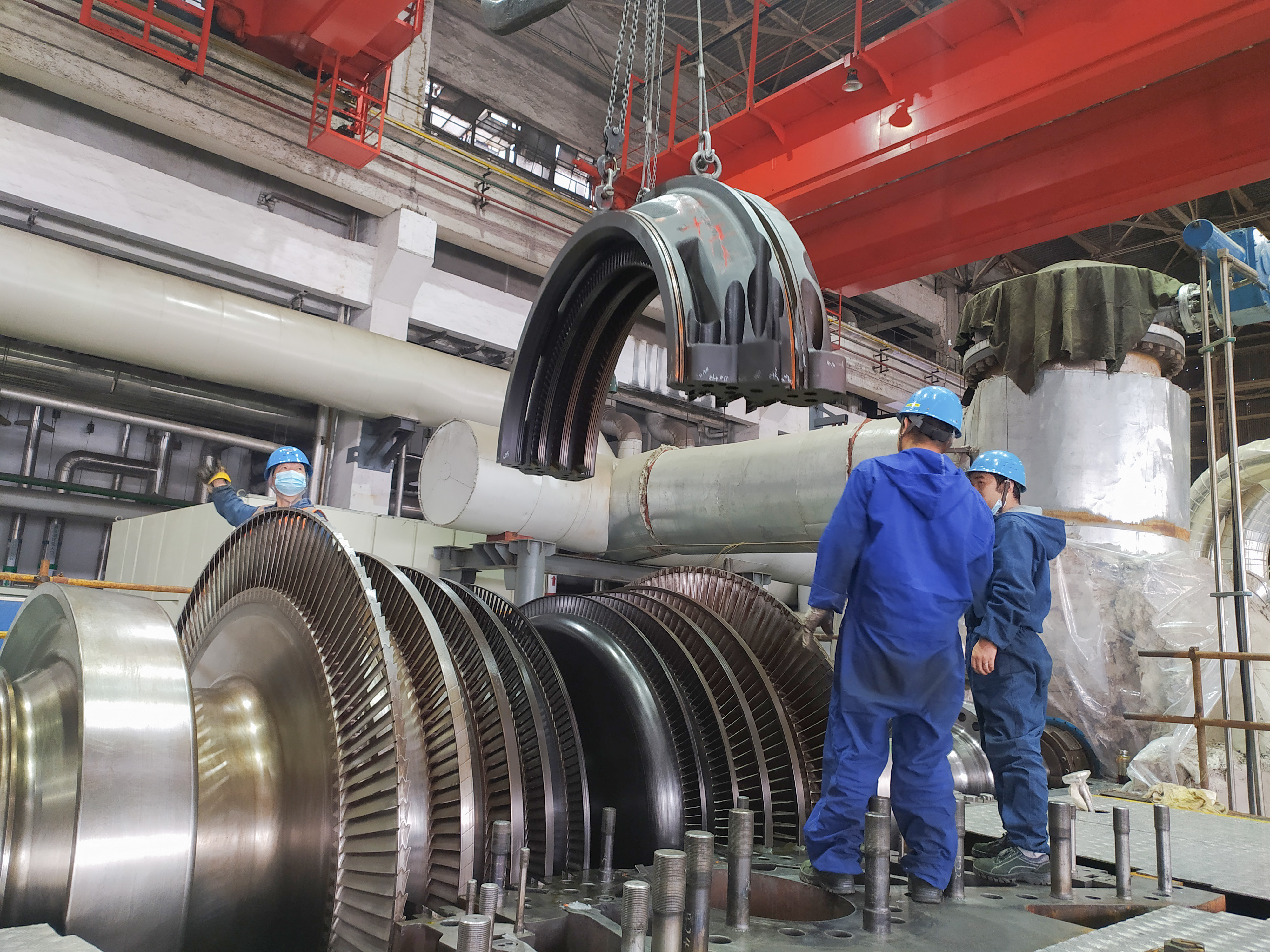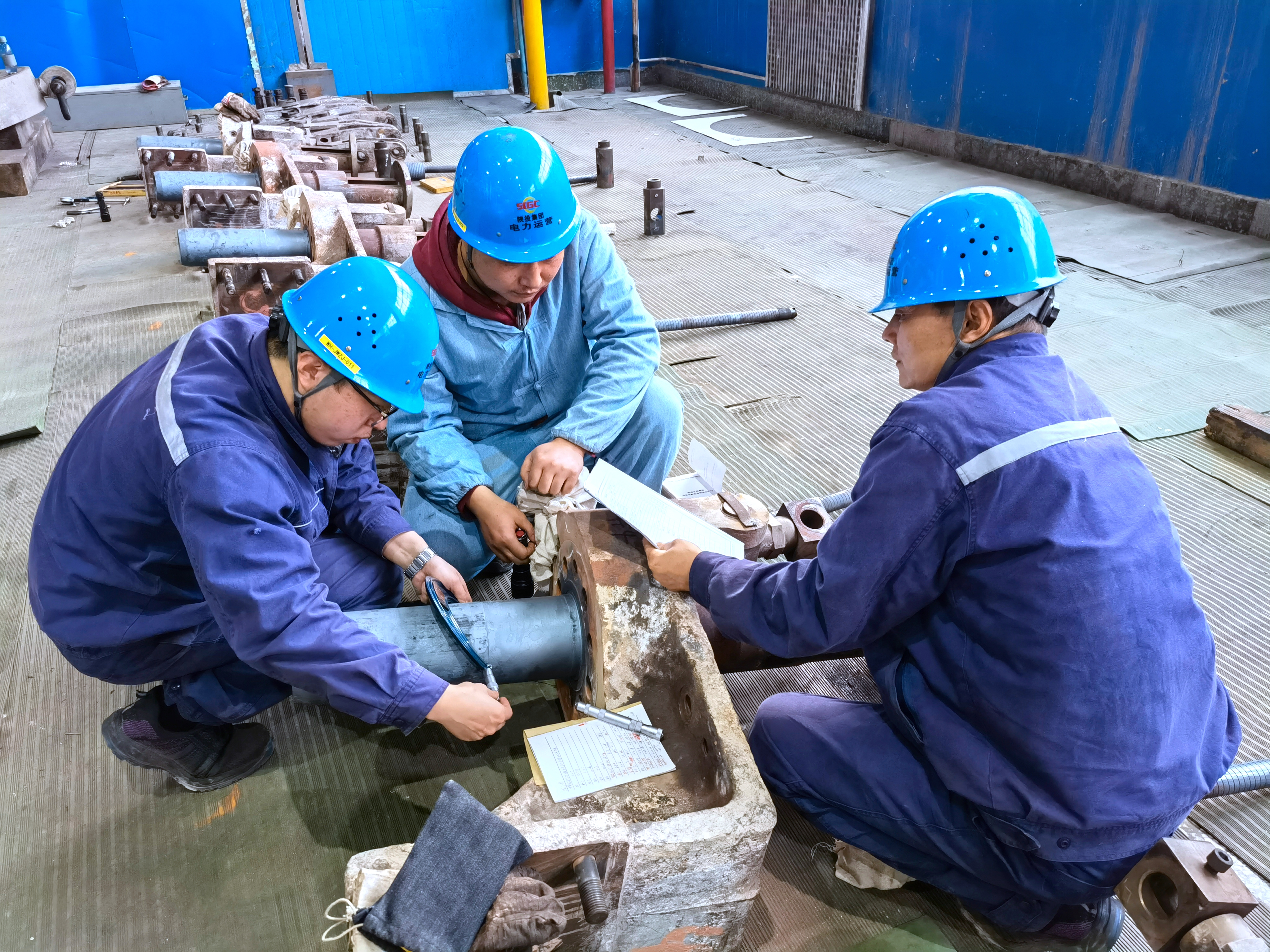 11月的渭北大地異常寒冷,夜間溫度達零下4、5℃,機房外呼氣成霧、滴水成冰???5機檢修現(xiàn)場內(nèi)卻是熱火朝天?!耙欢?,一二……”龐大的汽缸旁,突擊隊員們喊著號子,有的雙腿成弓步,上身微微后傾,使勁掄起大錘,有的身體半蹲,雙手緊緊握住套管,相互配合擰緊螺絲。豆大的汗水一滴一滴,在他們的臉頰流淌。