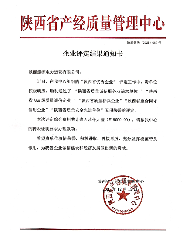 近日,經陜西省產經質量管理中心評定,公司榮獲“陜西省質量標兵企業(yè)”“陜西省AAA級質量誠信企業(yè)”“陜西省質量安全先進單位”“陜西省質量誠信服務雙滿意單位”“陜西省重合同守信用企業(yè)”等五項榮譽稱號。
