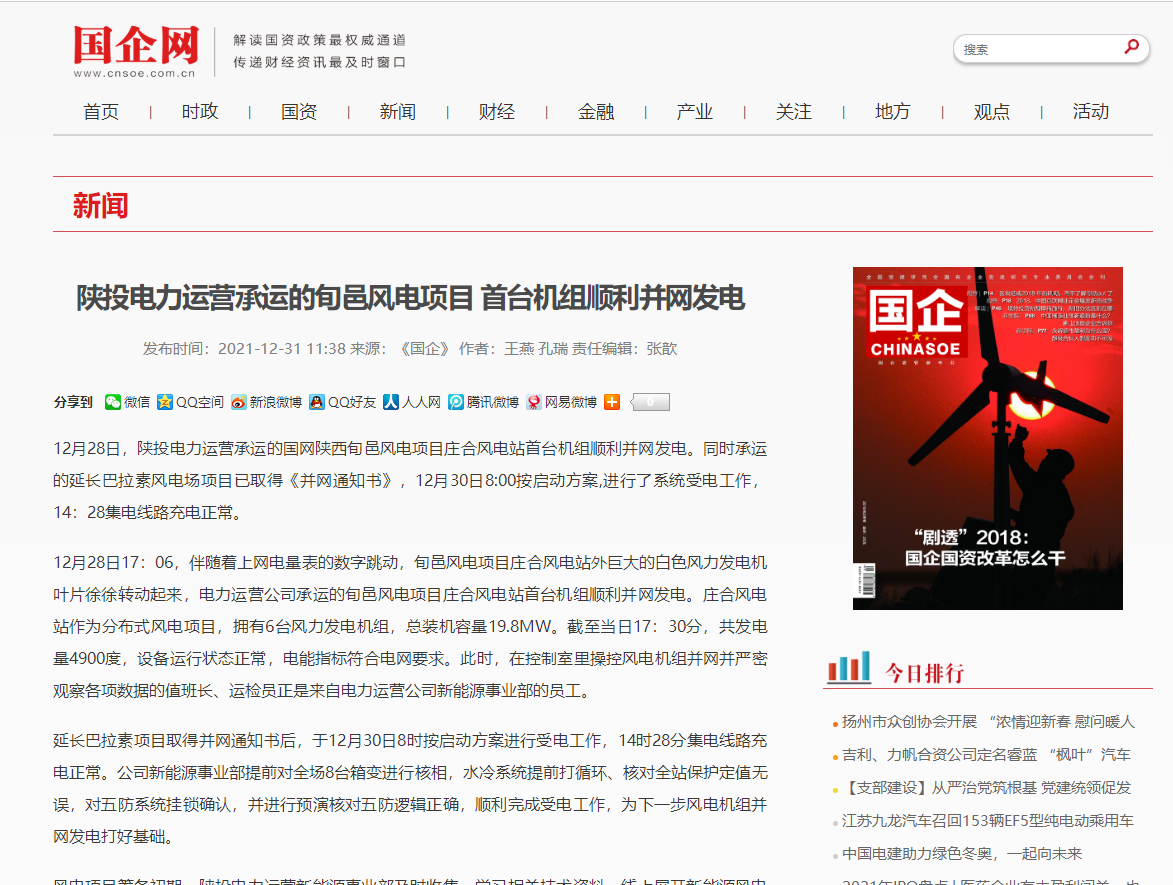 近日,公司承運的國網(wǎng)陜西旬邑風電項目莊合風電站、延長巴拉素風電首臺機組相繼并網(wǎng)發(fā)電。這是電力運營承接的首臺和第二臺風電項目,為公司深耕風力發(fā)電領域提供了經(jīng)驗和技術儲備。