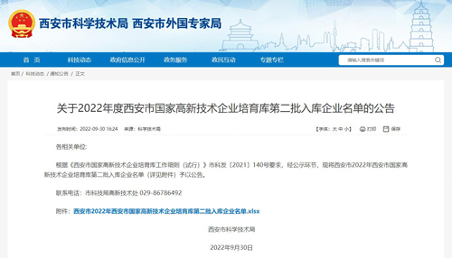 近日,西安市科學(xué)技術(shù)局發(fā)布了2022年度西安市國家高新技術(shù)企業(yè)培育庫第二批入庫企業(yè)名單,君創(chuàng)科技成功入選,入庫編號GQPY2022004751。
