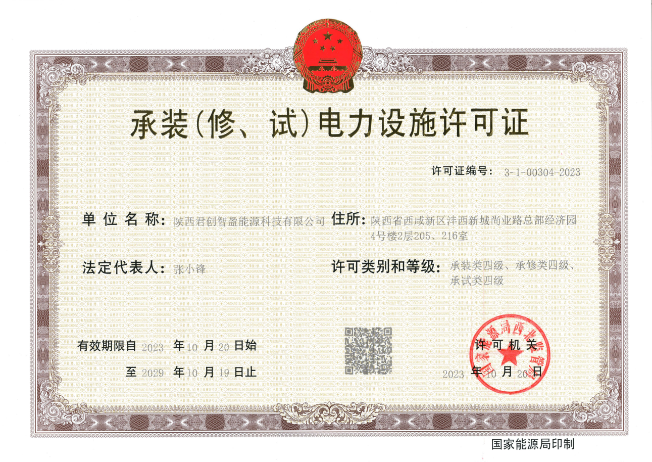 近日,經(jīng)國家能源局西北監(jiān)管局審核批準(zhǔn),君創(chuàng)科技成功獲得“承裝(修、試)電力設(shè)施許可證”資質(zhì)。