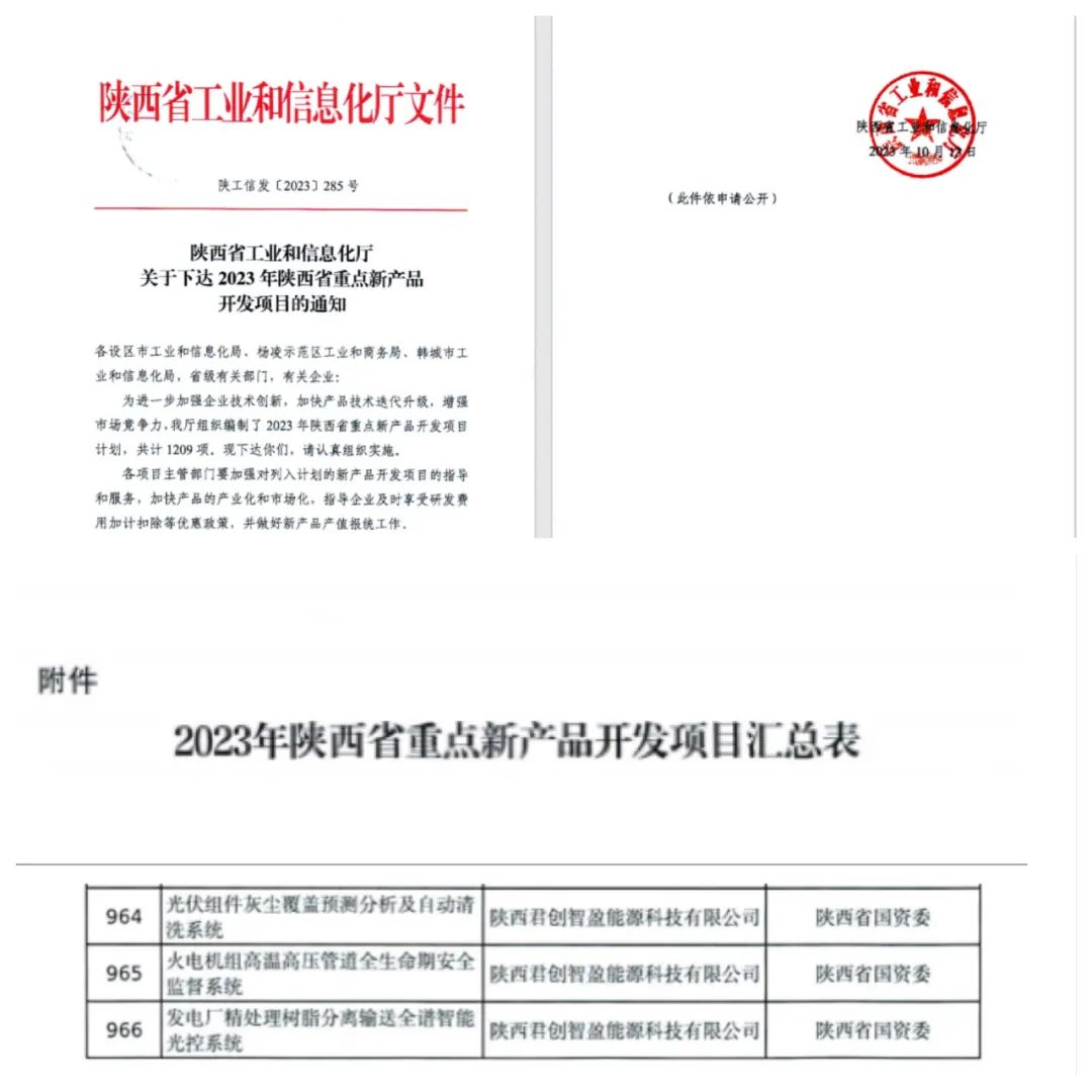 日前,陜西省工信廳發(fā)布了《關(guān)于下達2023年陜西省重點新產(chǎn)品開發(fā)項目的通知》,君創(chuàng)科技光伏組件灰塵覆蓋預(yù)測分析及自動清洗系統(tǒng)、火電機組高溫高壓管道全生命期安全監(jiān)督系統(tǒng)和精處理樹脂分離輸送全譜智能光控系統(tǒng)等3個項目入選。