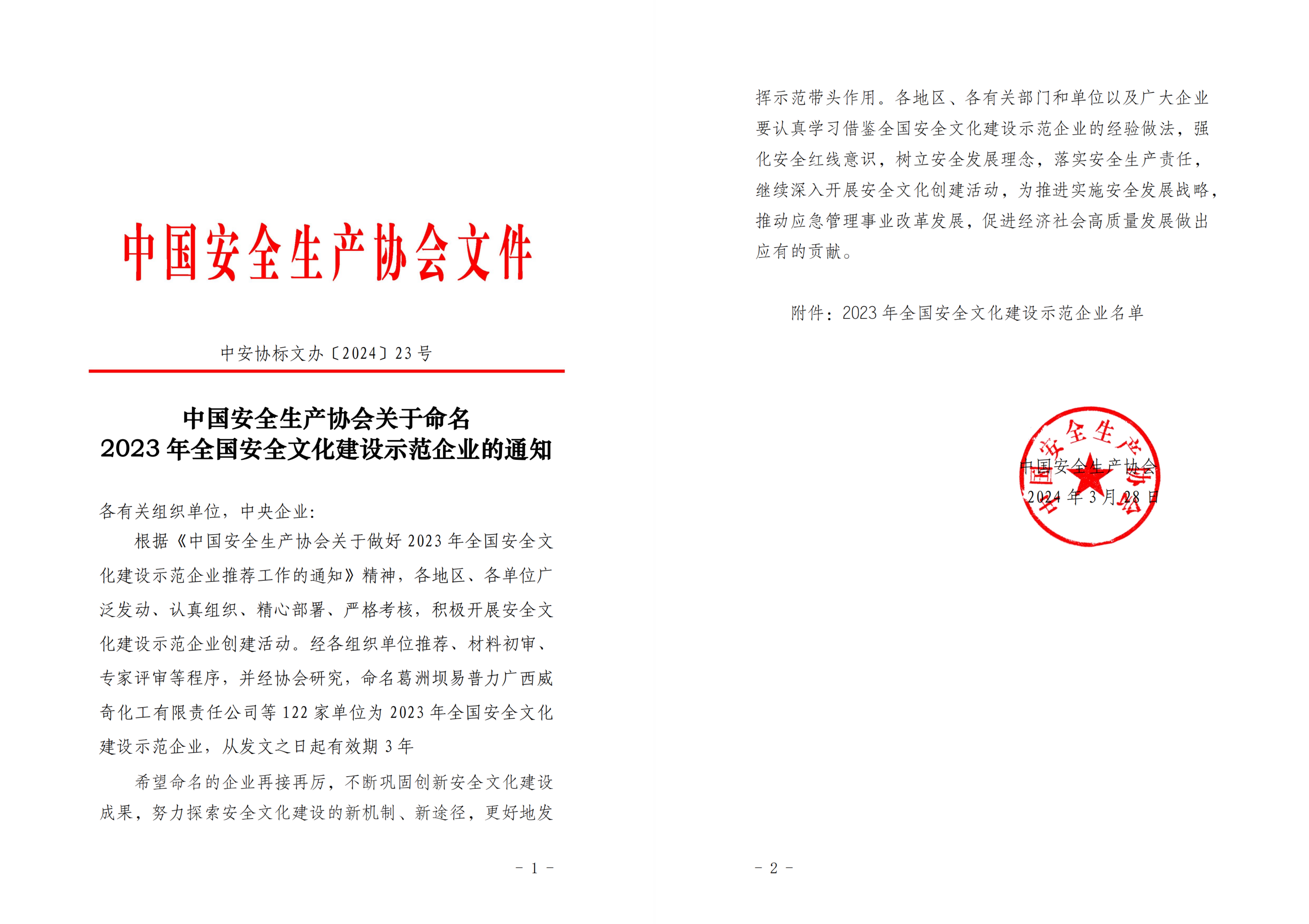 3月28日,公司被中國(guó)安全生產(chǎn)協(xié)會(huì)命名為“2023年全國(guó)安全文化建設(shè)示范企業(yè)”。這是公司繼實(shí)現(xiàn)安全生產(chǎn)標(biāo)準(zhǔn)化一級(jí)達(dá)標(biāo)和取得“省級(jí)安全文化建設(shè)示范企業(yè)”稱號(hào)后,在安全管理方面取得的又一重要突破,標(biāo)志著公司培育“想安全、會(huì)安全、能安全”本質(zhì)安全型員工,建立安全文化長(zhǎng)效機(jī)制取得重大進(jìn)展。