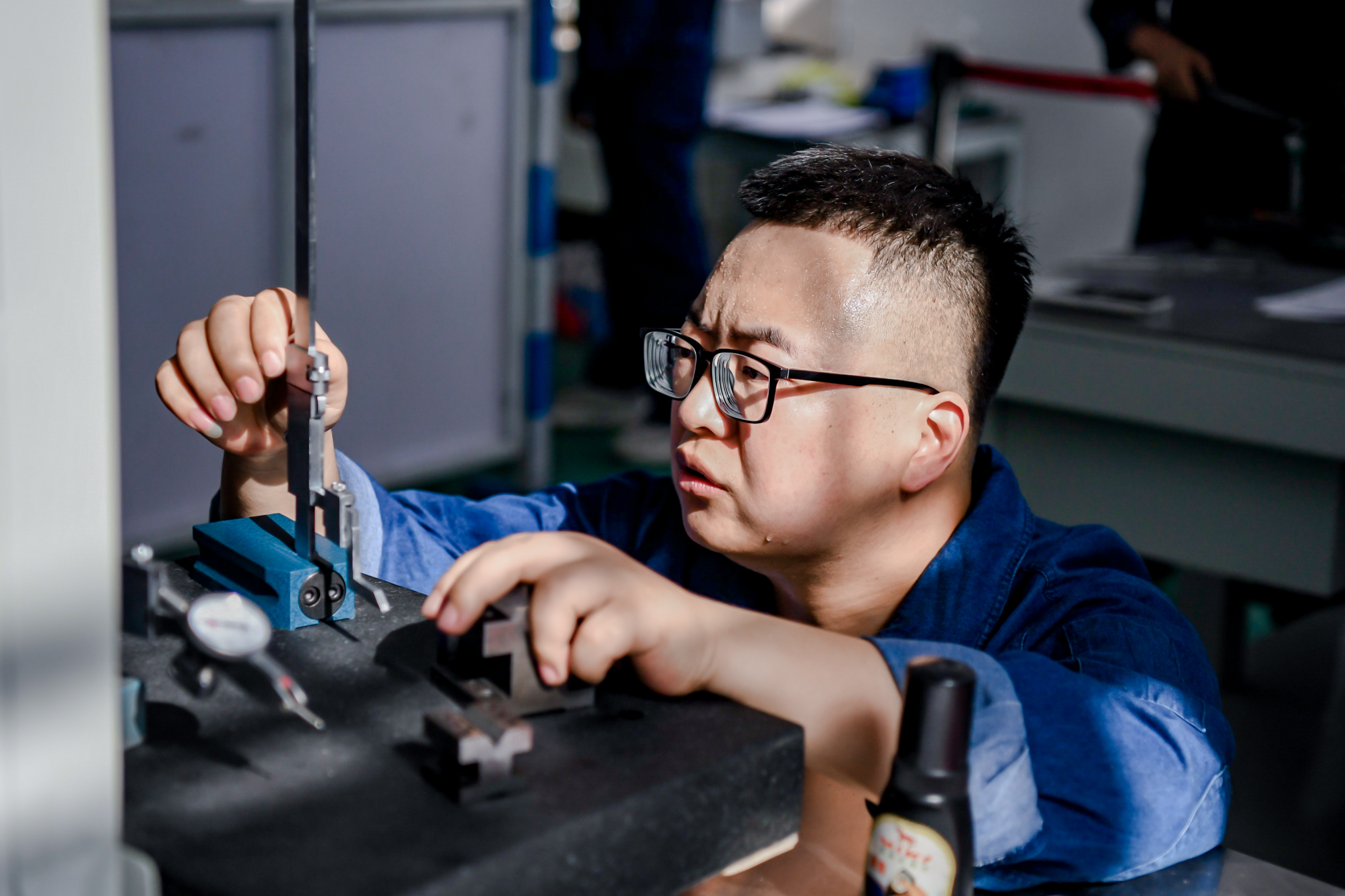 鉗工實(shí)操賽場(chǎng),參賽選手或銼削或鉆孔或攻螺紋,一板一眼、得心應(yīng)手。他們要在5個(gè)小時(shí)內(nèi)按照?qǐng)D紙要求制作工件,將工件打磨、研修、修整后達(dá)到精度要求。“鉗工是所有加工技術(shù)的基礎(chǔ),包含10多道工藝,所以有著‘萬能工種’的說法,要求精度達(dá)到0.02毫米,差不多是一根頭發(fā)絲的三分之一。”現(xiàn)場(chǎng)裁判劉方明感慨地說。