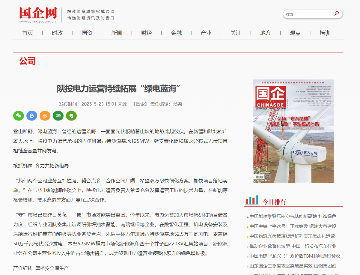 “守”市場已是昨日黃花,“搏”市場才能突出重圍。今年以來,電力運營加大市場調(diào)研和項目儲備力度,組織專業(yè)團(tuán)隊密集走訪調(diào)研佛坪抽水蓄能、南瑞繼保等企業(yè),在數(shù)智化工程、機電設(shè)備安裝及后續(xù)運行維護(hù)等方面積極尋找業(yè)務(wù)契合點,先后中標(biāo)古爾班通古特沙漠基地52.5萬千瓦風(fēng)電、麥蓋提50萬千瓦光伏治沙發(fā)電、木壘525MW疆內(nèi)市場化新能源和四十個井子西220KV匯集站項目,新能源業(yè)務(wù)在公司主營業(yè)務(wù)收入中的占比穩(wěn)步提升,成為驅(qū)動電力運營業(yè)績整體躍升的綠色增長極。