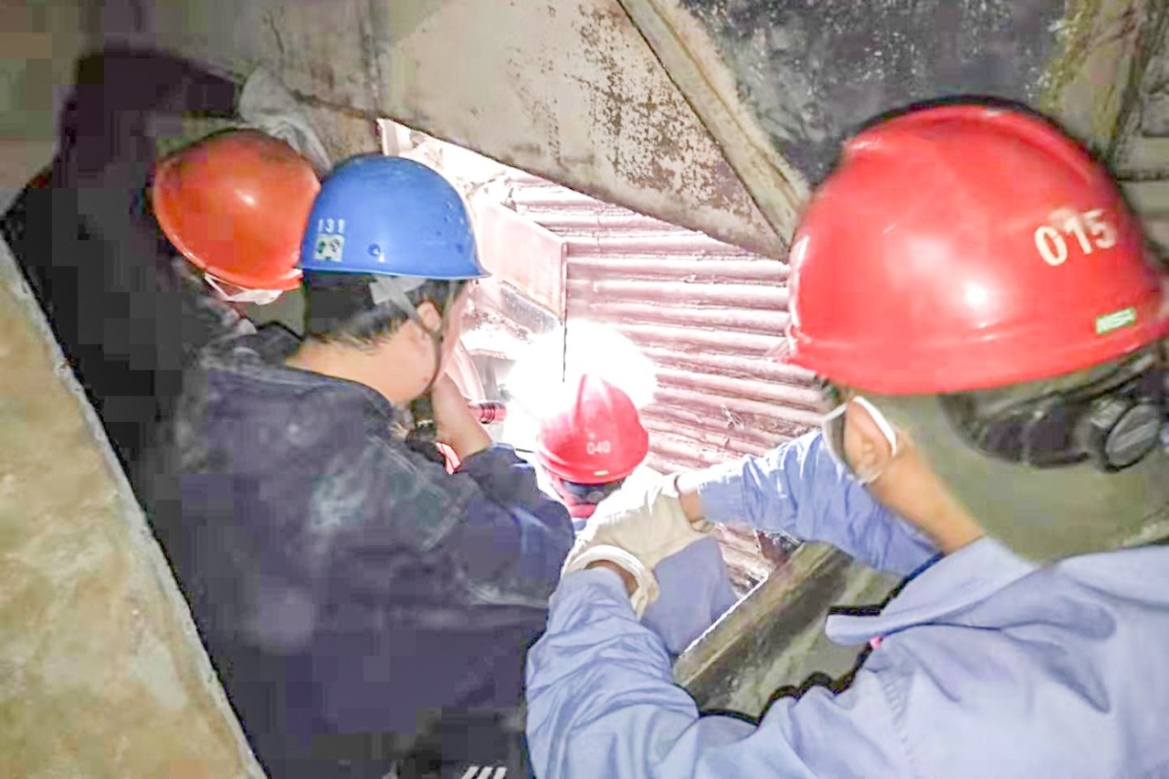 近日,商電#2機組停運后,鍋爐班人員檢查發(fā)現(xiàn)爐水冷壁管道標高20米處有一砂眼,但由于爐膛外管道錯綜復雜,作業(yè)地點又處于風箱內(nèi)部,給檢修工作帶來極大的困難。工作人員在割掉2塊鋼板,穿過層層障礙,到達工作面后,又發(fā)現(xiàn)水冷壁管外還有三塊限位鋼板擋在面前。最終,排除重重“攔路虎”后,工作人員內(nèi)外配合,經(jīng)過一天緊張的割管、制口和焊管工作,圓滿完成此項任務。