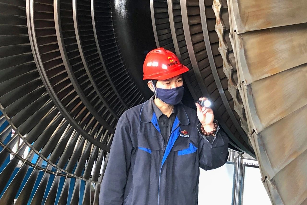 3月13日,渭河項(xiàng)目部機(jī)務(wù)隊(duì)主機(jī)班詹涇永在檢查汽輪機(jī)葉片