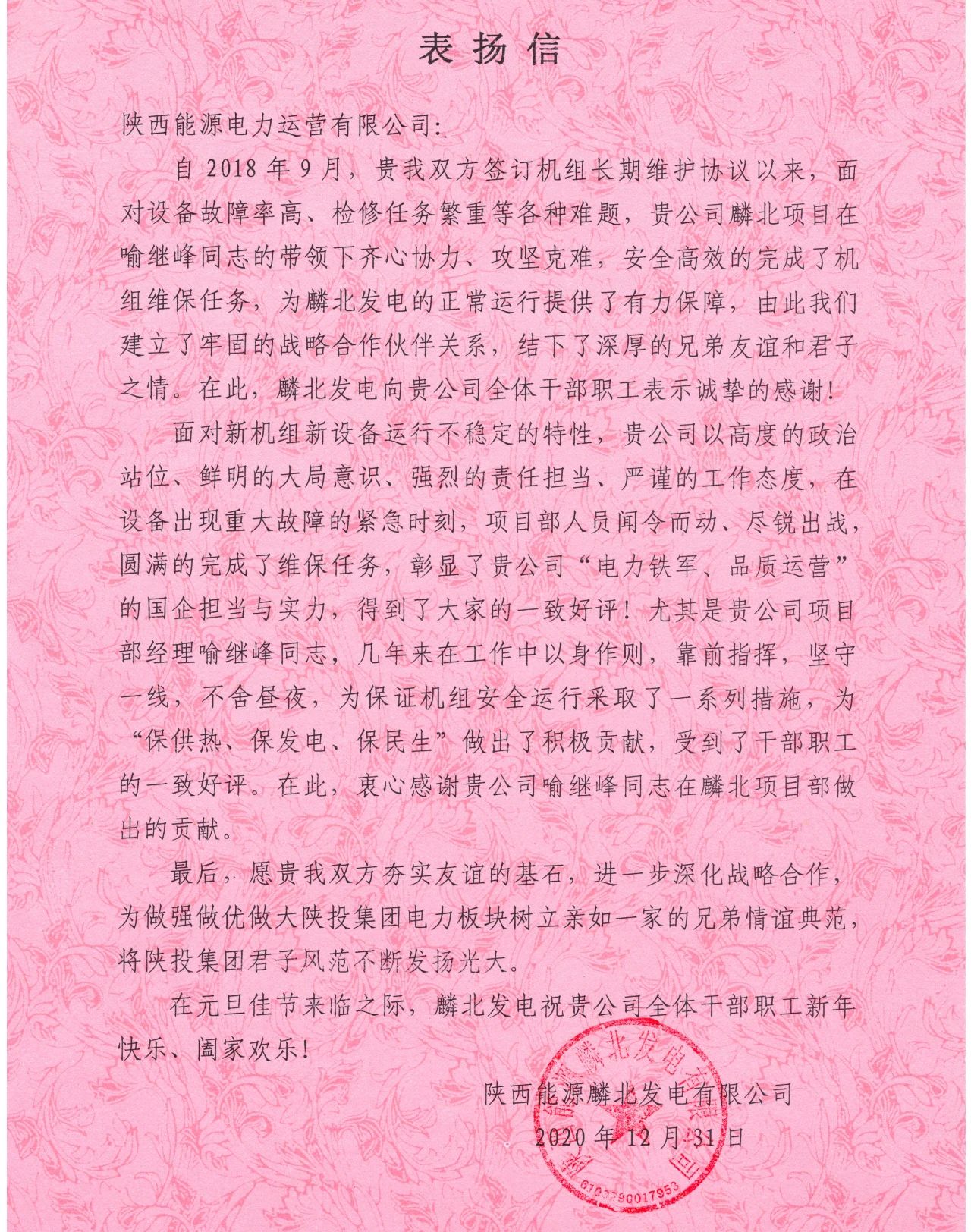 近日,公司收到來自麟北發(fā)電的表揚信,感謝麟北項目部自2018年成立來安全高效完成機組維保任務,在設備出現(xiàn)重大故障的緊急時刻聞令而動、盡銳出戰(zhàn),確保設備安全運行,充分彰顯了“電力鐵軍、品質(zhì)運營”的擔當與實力。