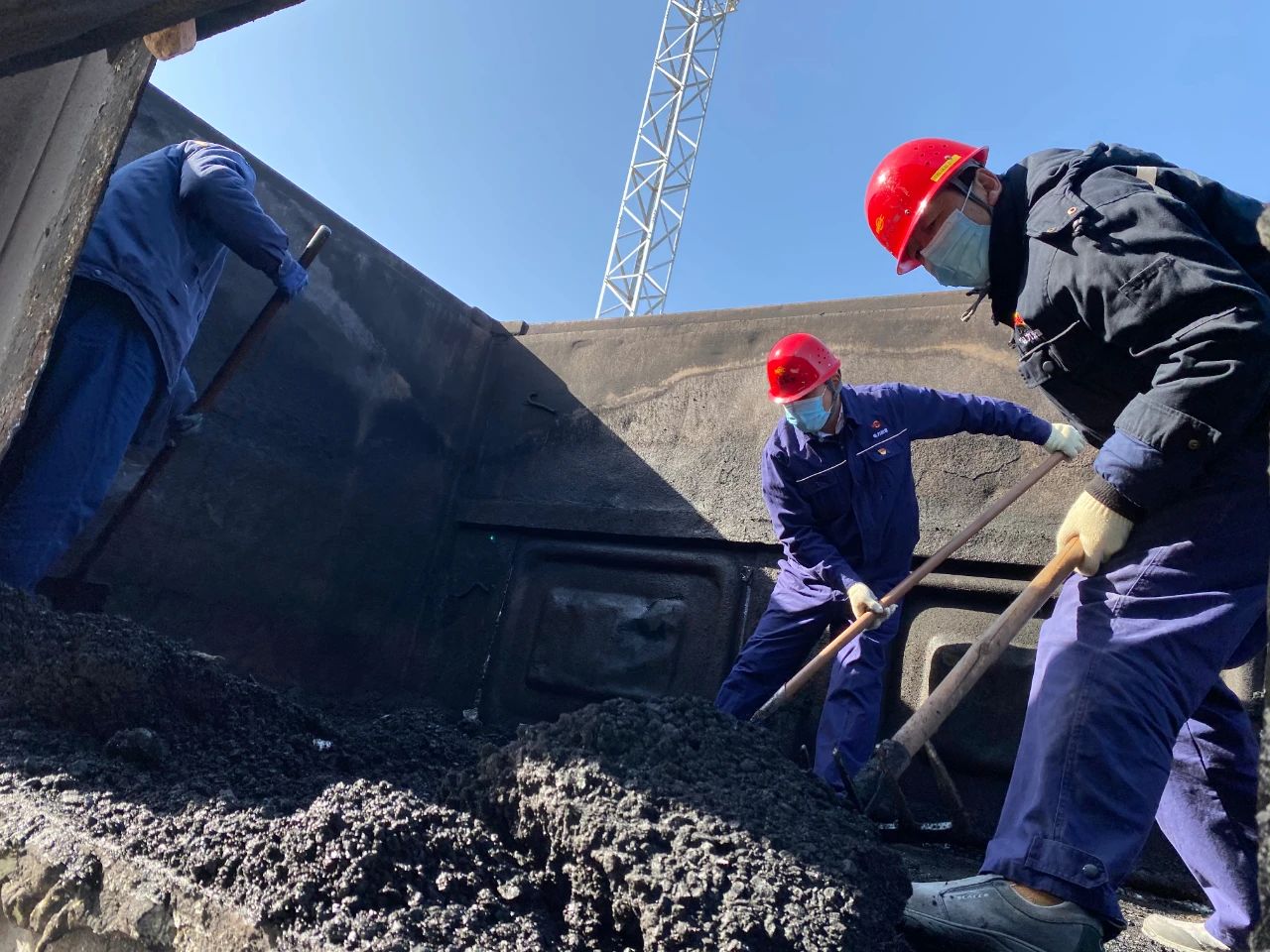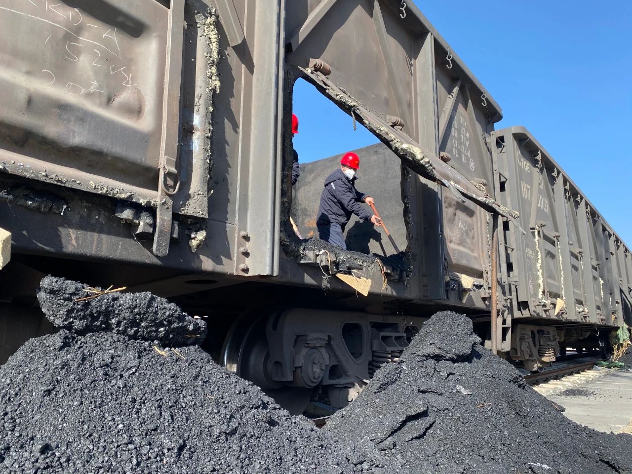 1月12日,商洛項目部從管理干部中緊急抽調(diào)18名人員奔赴煤場,對“凍煤”展開人工清理。清理凍煤是一項費(fèi)勁的體力活,更是一項費(fèi)時的細(xì)活。車廂內(nèi),工作人員有序分工,揮動鐵鎬和鐵鍬,清理著車廂底部、拐角等處的凍煤。厚厚的凍煤堅硬如鐵,工作人員掄圓胳膊,使勁揮動鎬頭卻只“啃”下很小的一塊。一鎬鎬挖,一塊塊敲,一點(diǎn)點(diǎn)清,清理完一節(jié)車廂,汗水早已濕透了棉服,卻沒有一個人停下手上的活,又馬不停蹄轉(zhuǎn)戰(zhàn)另一節(jié)車廂。