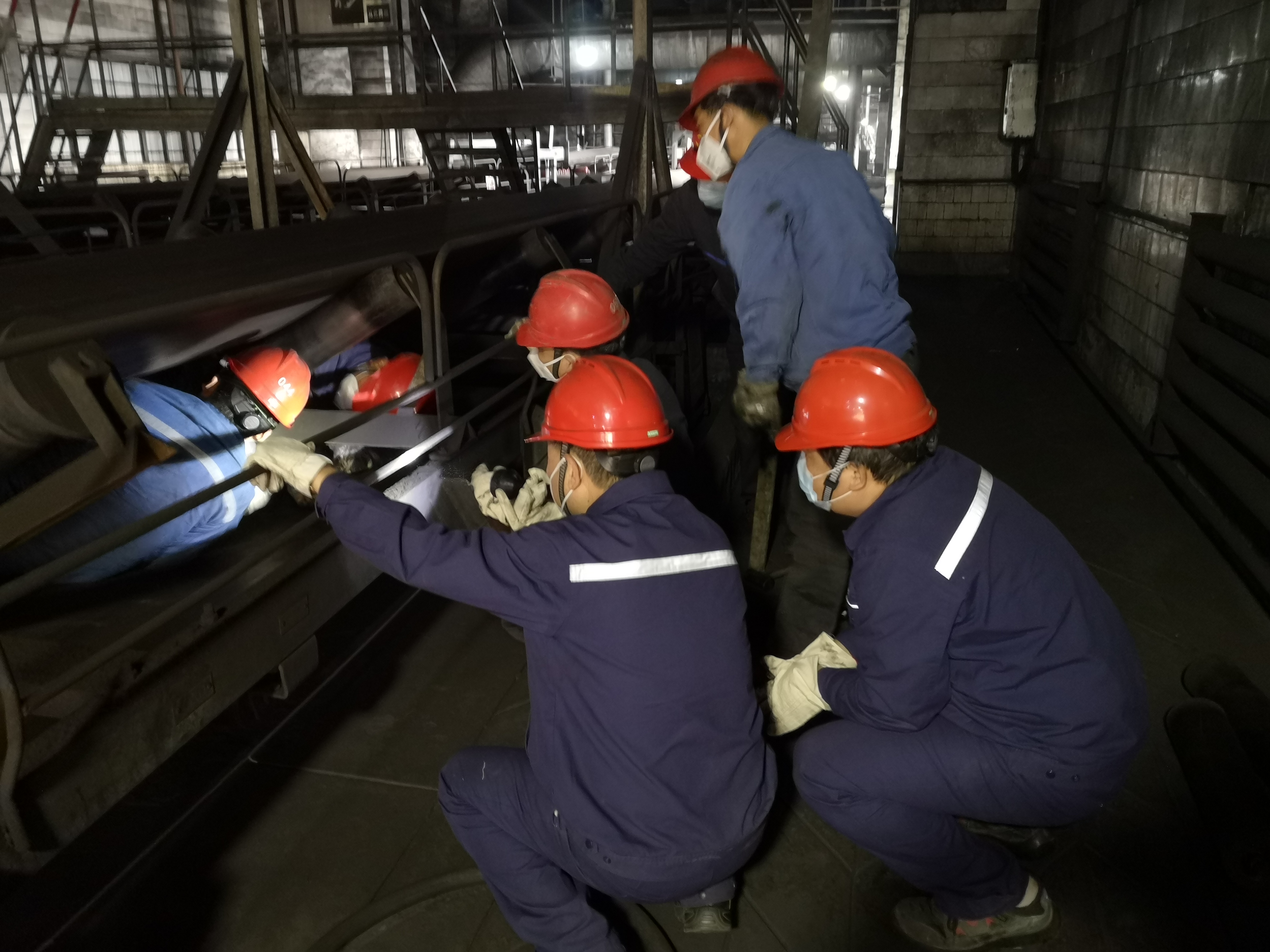 搶修現(xiàn)場,狹窄的空間內,突擊隊員弓著身子,用背使勁頂起沉重的皮帶,使損壞托輥處于無壓力狀態(tài),再小心地用榔頭一下一下敲擊槽口將其拆下,然后將新托輥放入槽口。工作中,時常遇到托輥卡死的情況,就需要焊工使用火焊將卡死的托輥割下來,而這一切都需要突擊隊員在皮帶下,或躺、或蜷,以各種“奇特”的姿勢進行,工作的難度可想而知。